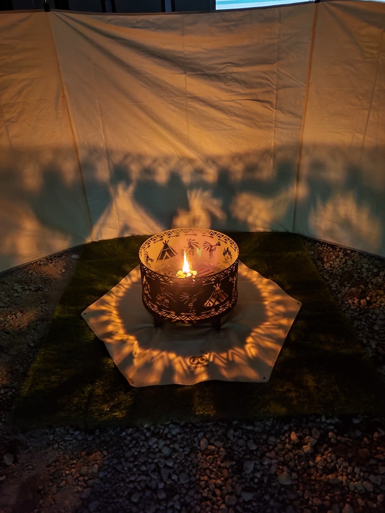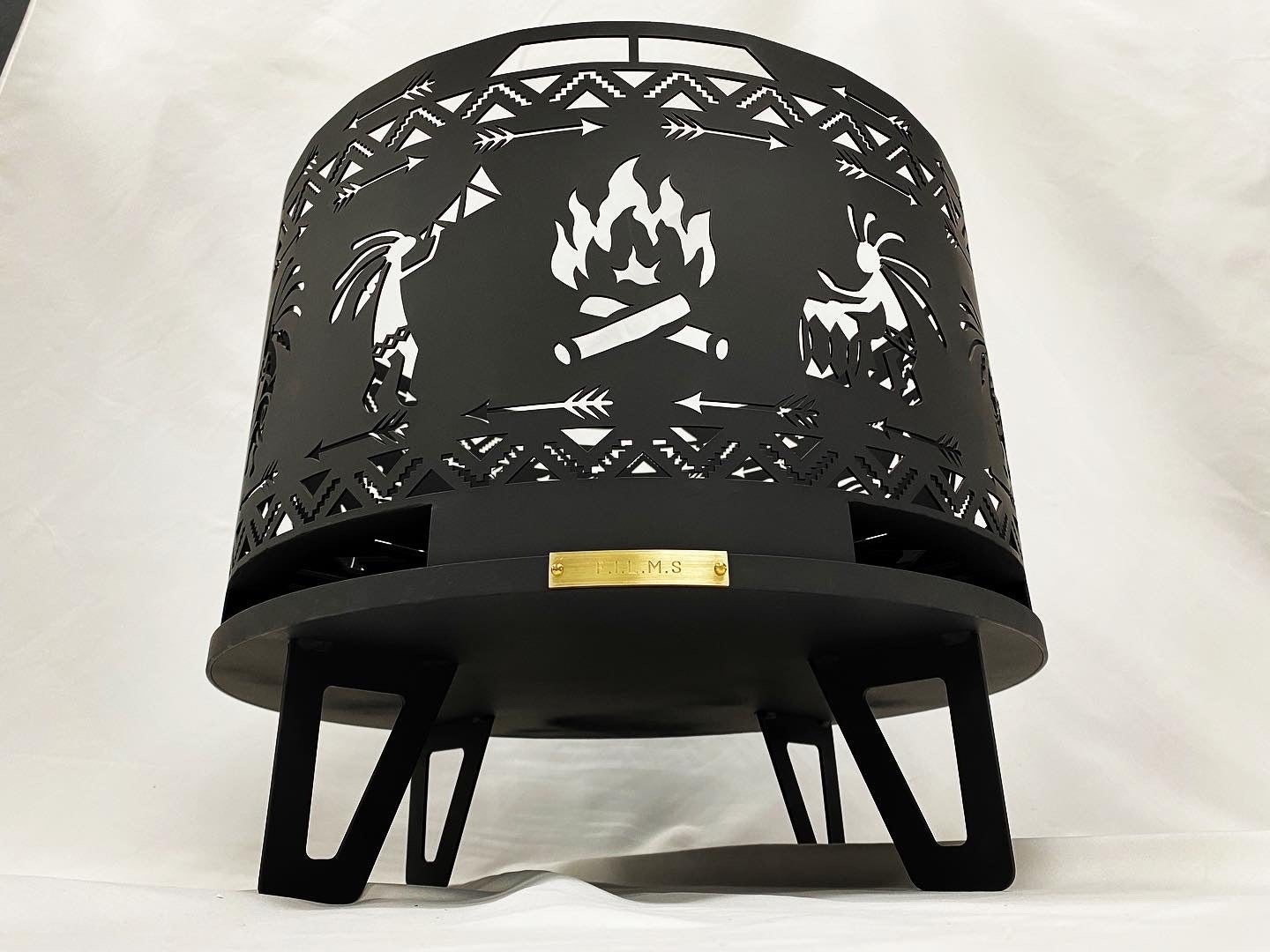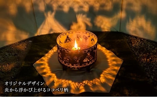 ゆらめく炎から浮かび上がるココペリ柄が焚き火を囲む人々の心を癒してくれます。