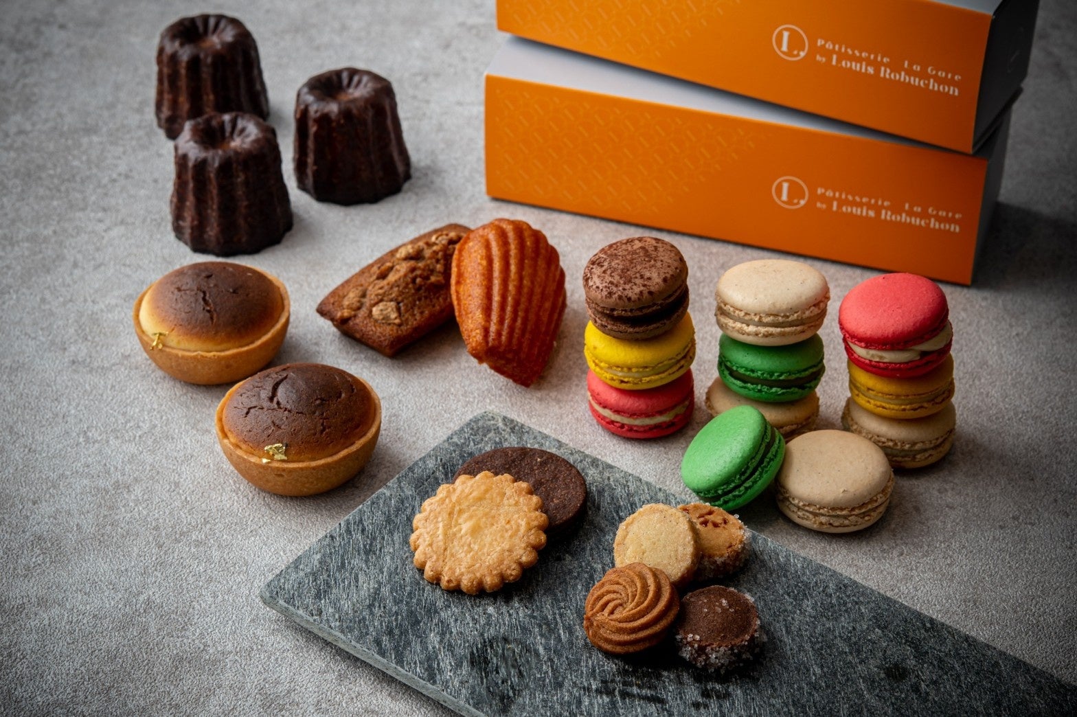 『Pâtisserie La Gare by Louis Robuchon』では、ルイ・ロブションがルーツを持つ、フランス・ポワティエで19世紀に生まれた洋菓子「トゥルトー」を始め、青のりや喜界島産黒糖、くるみを使った「フィナンシェ」、芋焼酎を用いた「モワルー」、高級ラム酒Rhum J.M XOをたっぷりと使った「カヌレ」など、フレンチシングルモルトAIKAN WHISKY香る「フォンダンショコラ」など、フランス人の父、日本人の母を持つルイ・ロブションにしか表現できない焼菓子を約25種取り揃えます。
