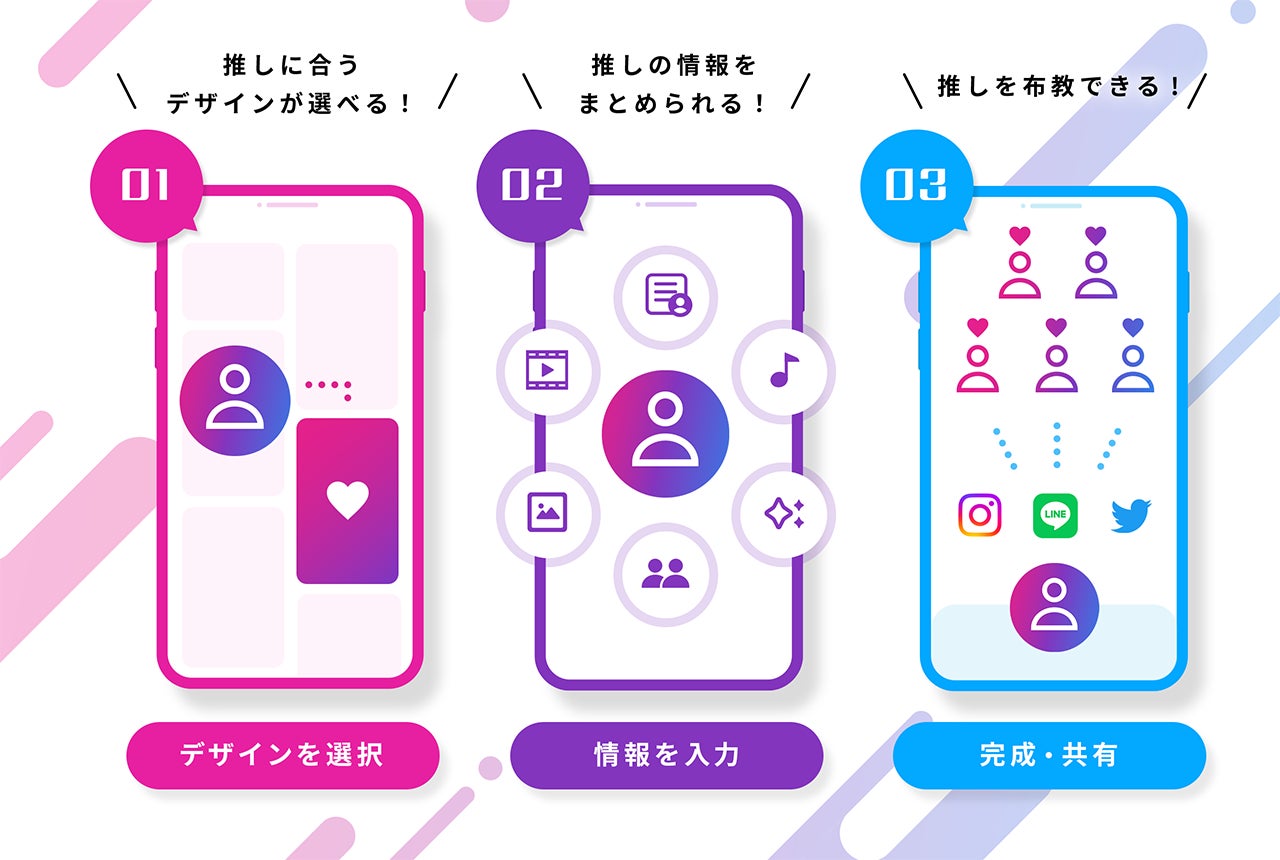 また、「推しらせ」は推しへの愛が可視化されるデザインを作成し、相手に合わせて布教の仕方を変えられる機能や各種SNSアプリと連携して、より推し活を快適に楽しくしていきます。