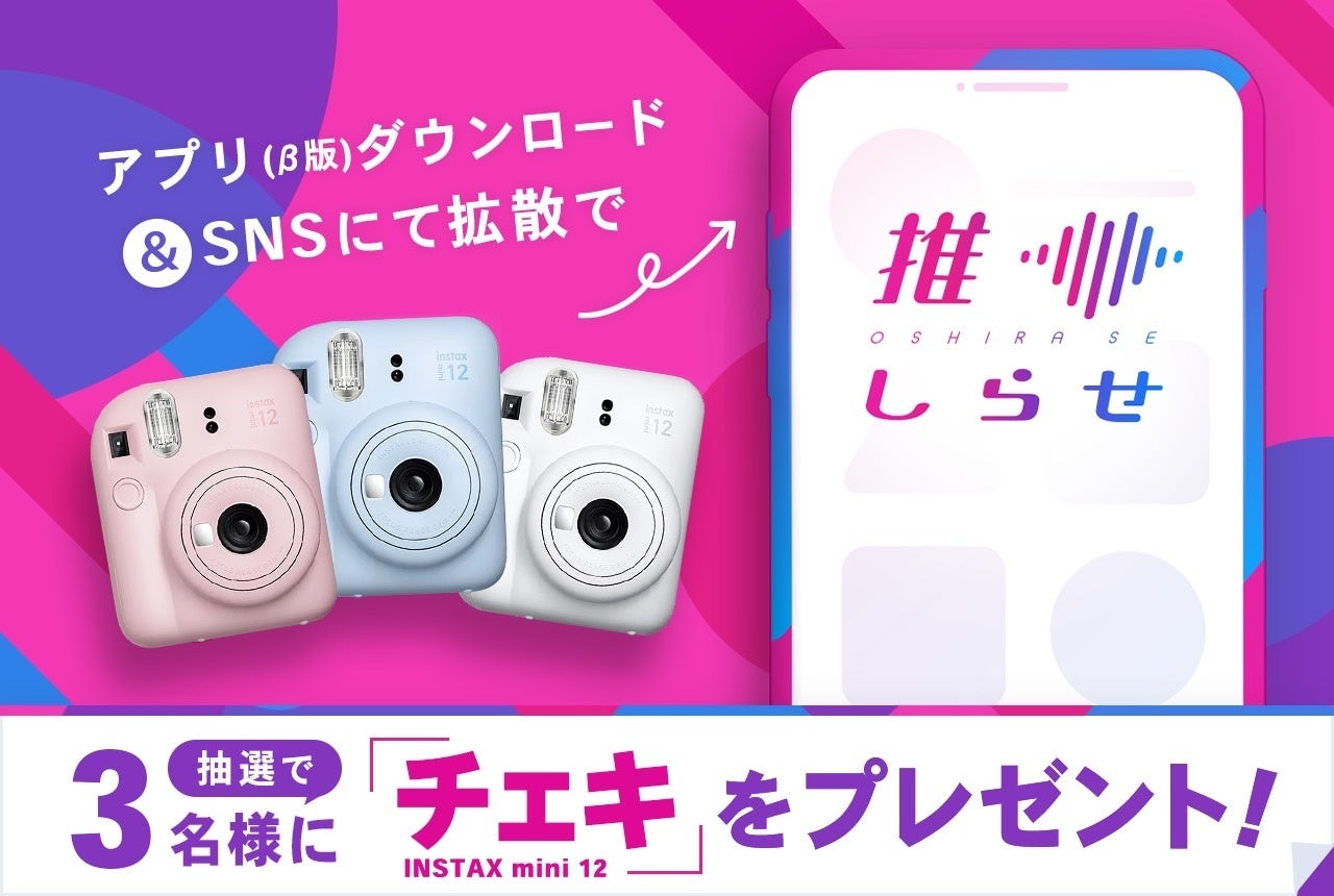 「推しらせ」を事前登録してくださった方から、抽選で3名に「推し活」をより楽しむアイテム、チェキをプレゼントいたします。事前登録いただき、アプリをSNS拡散をしてくださった方は当選確率アップとなります。