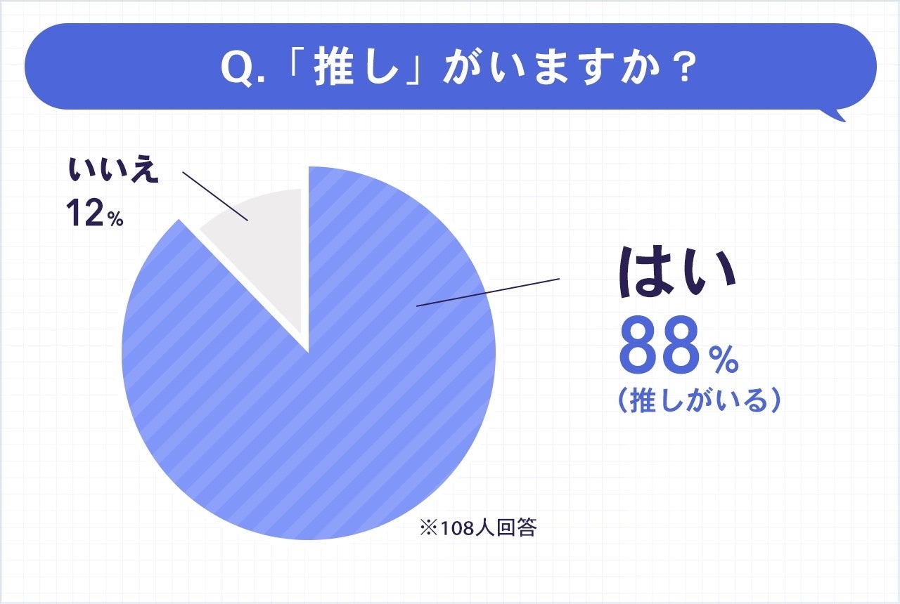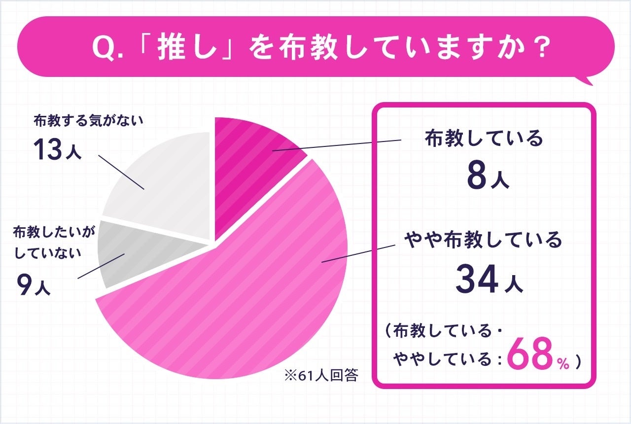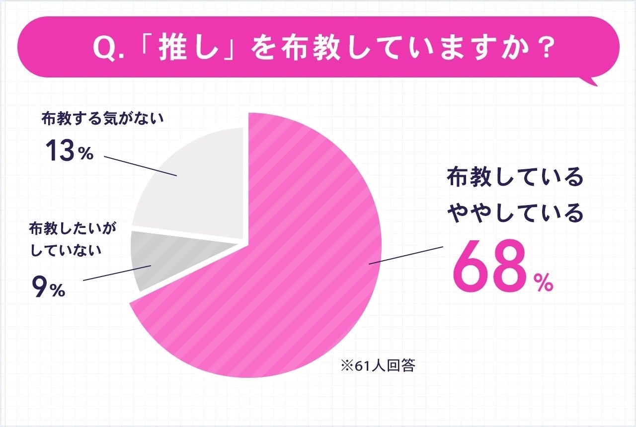 また、2023年5月に弊社にて実施した「推しの布教に関する調査」では、20代女性を中心に現在推しがいる方は88%、その中で布教活動を行なっている方は68%という結果となりました。