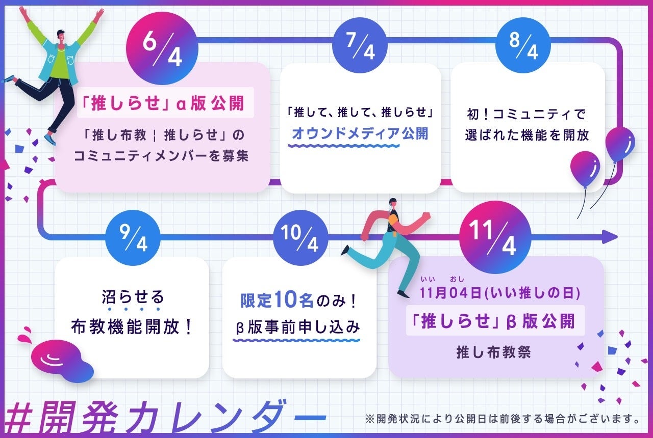 α版リリース後、ユーザーからの声を反映させ新機能を追加しながら、2023年11月4日(いい推しの日)にβ版としてリリース予定です。また、α版リリース後も、4日を推しの日とし、新機能を追加していきます。