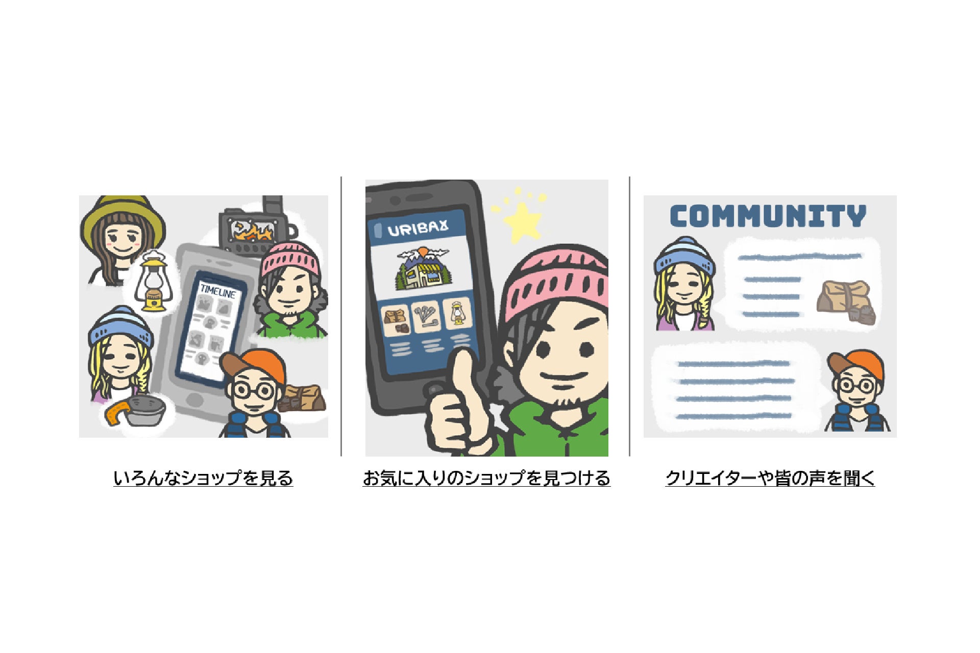 キャンプの前にはURIBAに出店している個性的なショップを覗いてお気に入りの商品を購入、商品が届いたら次のキャンプが待ち遠しくなるようなマーケットプレイスを目指していきます。