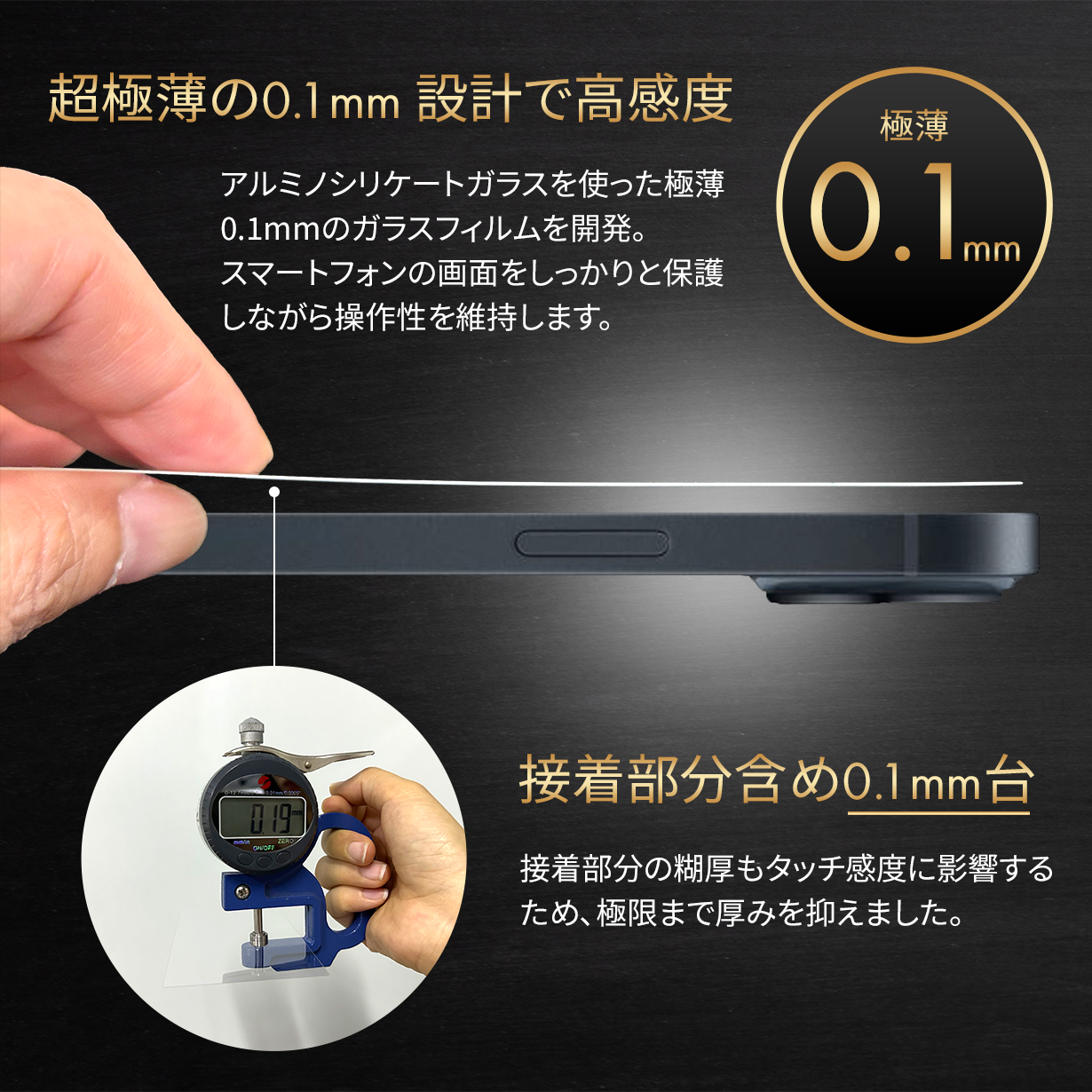 そこでスマートフォンの画面をしっかりと保護しながらも、操作性を犠牲にしないためにどうすべきか試行錯誤した結果、アルミノシリケートガラスを使った極薄0.1mmのガラスフィルムを開発することにいたしました。