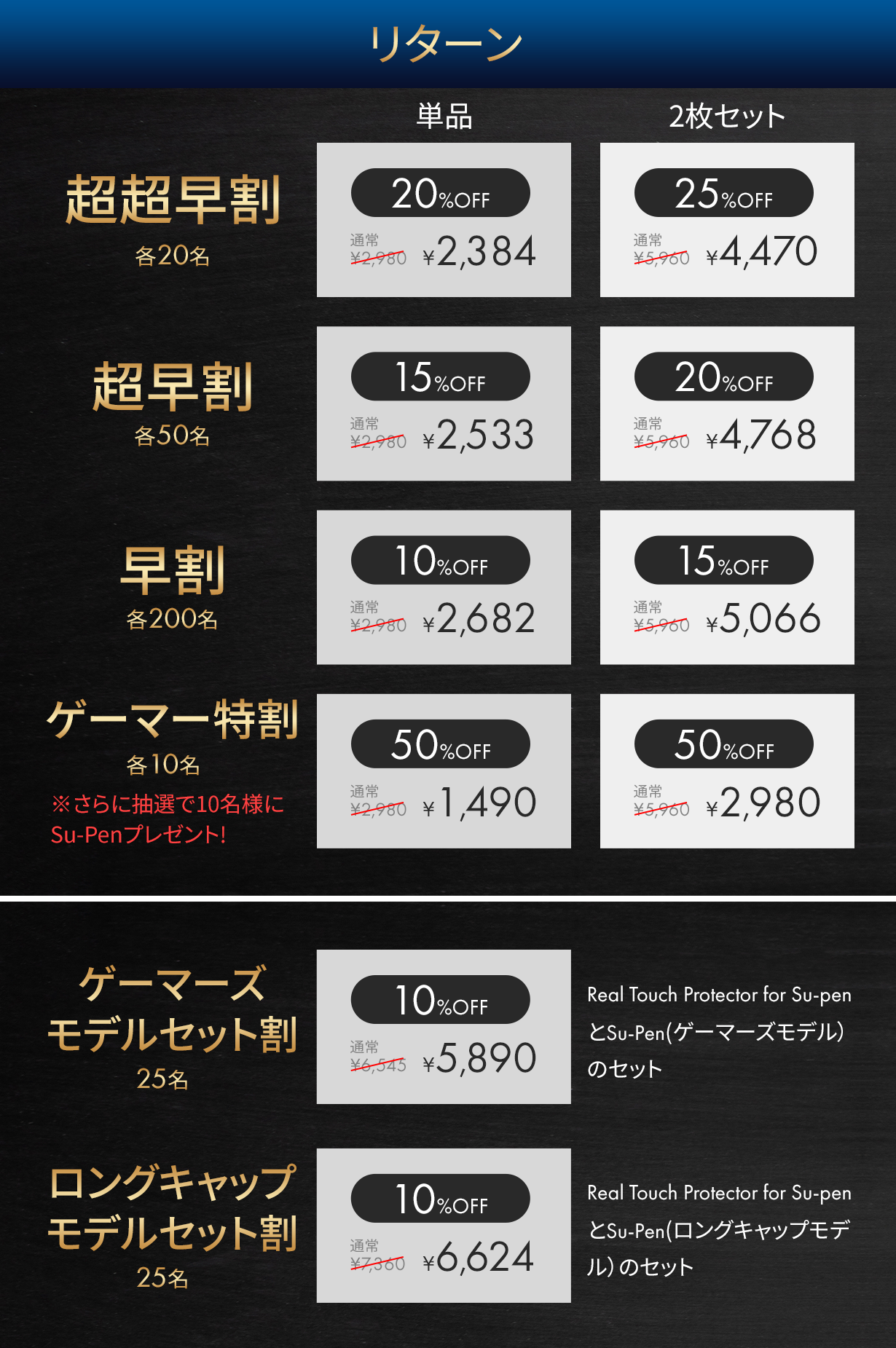 ゲーマー特割(ゲーム配信をしている方向け):先着各10名様 単品・2枚セット50%オフ+申込者に抽選で10名へSu-Penゲーマーズモデルをプレゼント