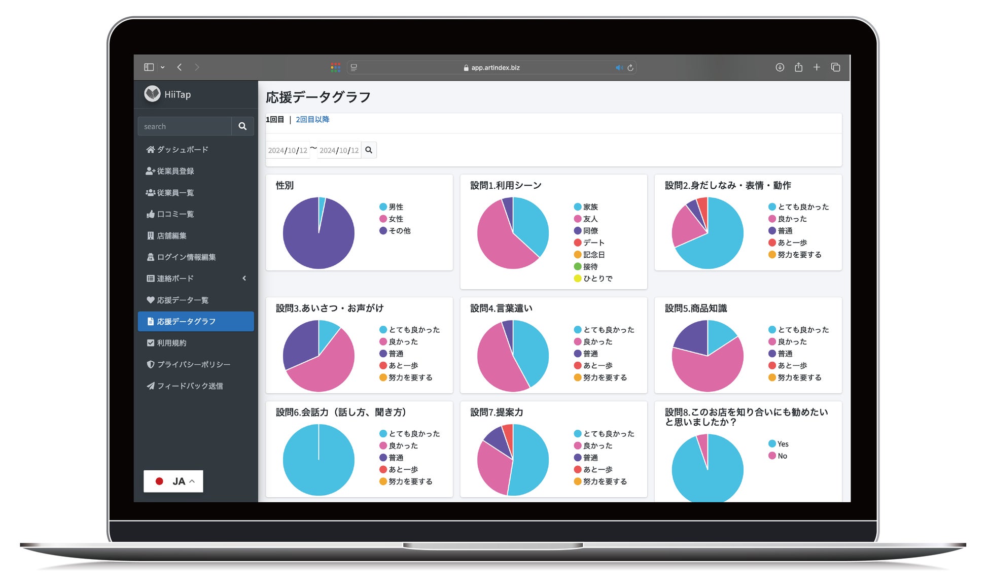 HiiTap導入後4ヶ月が経過し、従業員が常に見られているということを意識し始め、能動的に挨拶をしたり、立ち方や声のトーンを気をつけるといった取り組みを行うなど、すでに変化が見られています。また、HiiTap導入により、スタッフのモチベーションが向上し、顧客との距離がより一層縮まることによって、さらにアンケートの回答率も向上するといった好循環も生まれました。