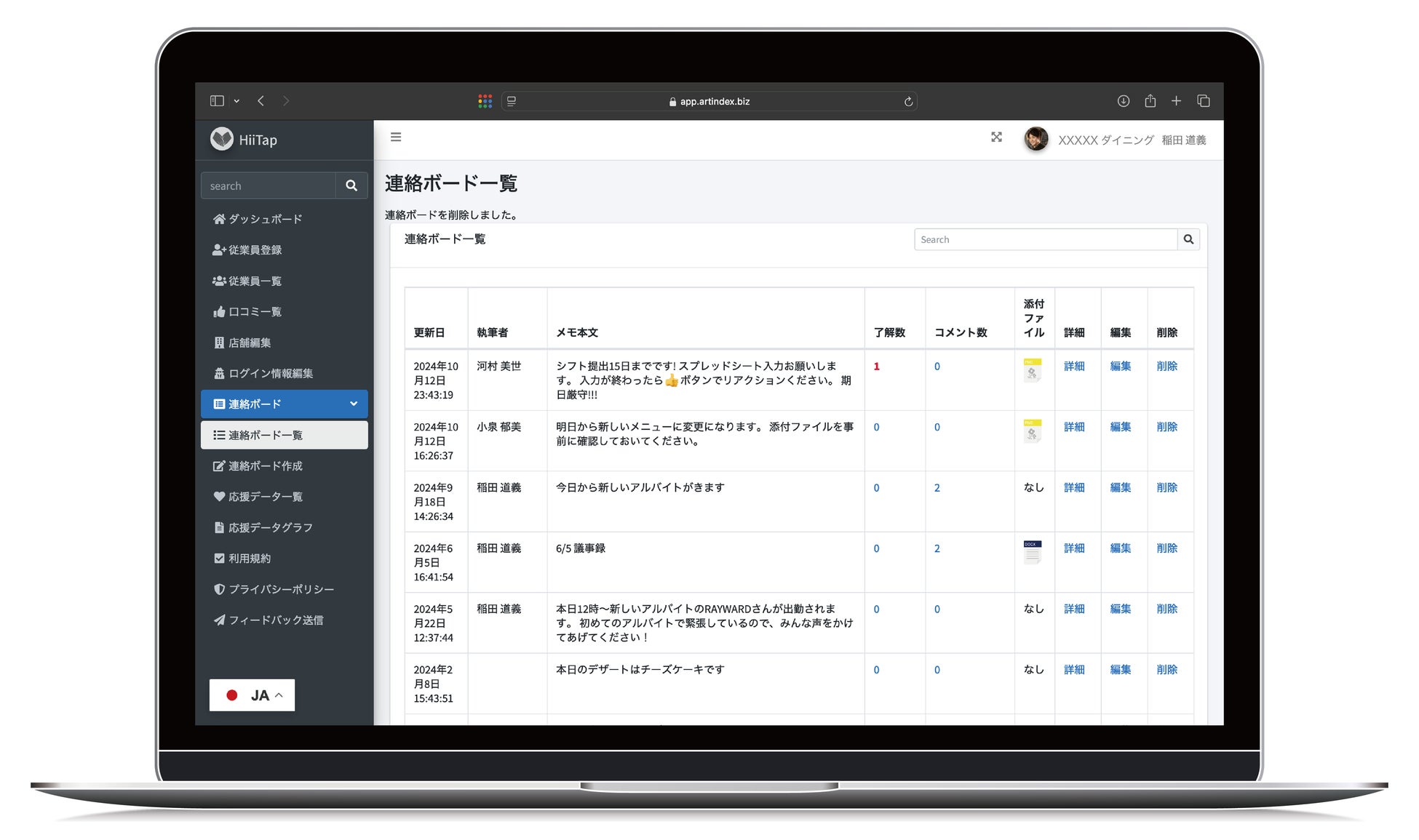 従業員同士の業務連絡をシンプルに管理する「連絡ボード」機能を搭載。シフト表やマニュアルなどのファイルを添付できるほか、スタンプやコメントで意思表示が可能です。業務連絡とプライベートなツールを分けることで、従業員のストレス軽減と職場での情報共有をスムーズにします。