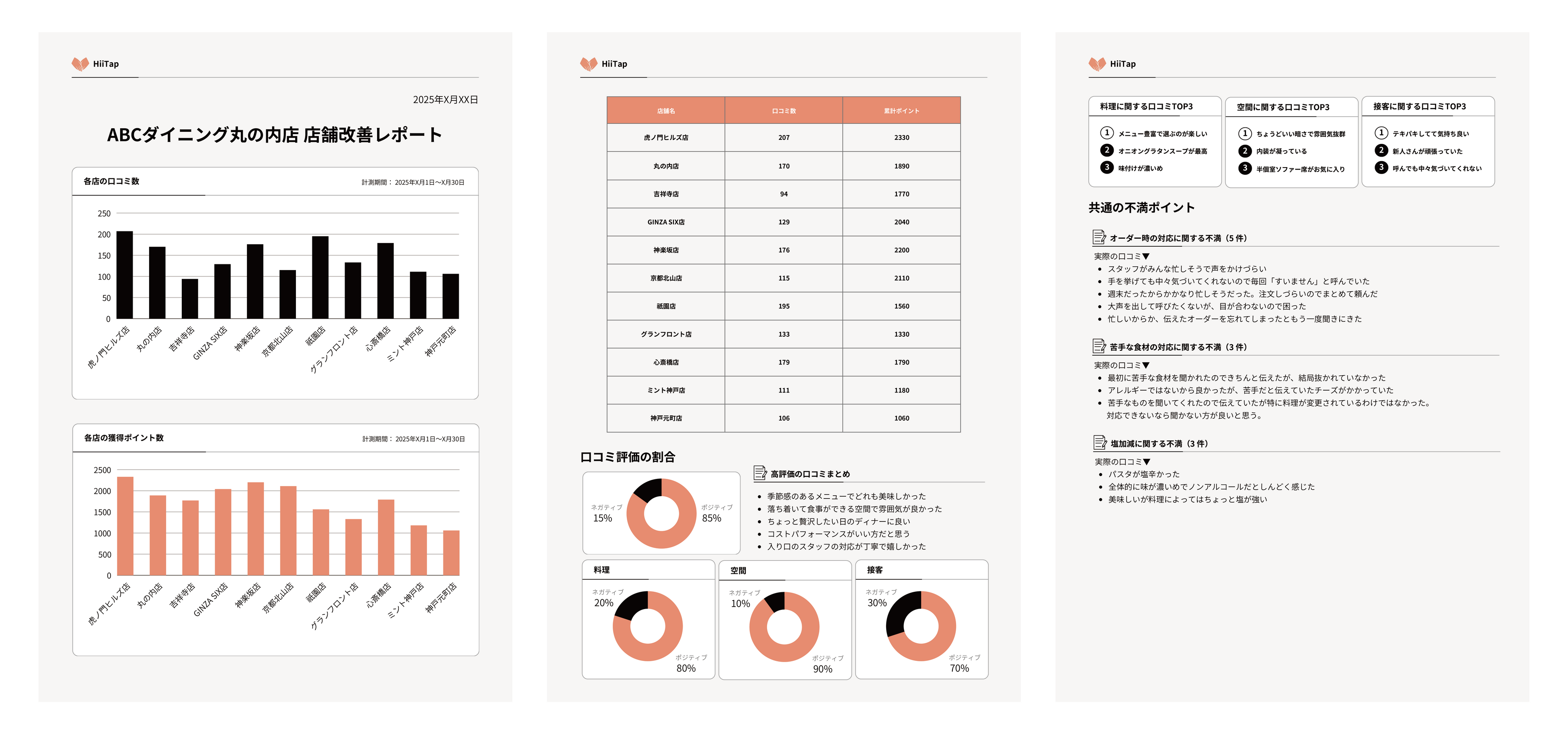 HiiTapにより、1ヶ月分のレビューデータを集約し、店舗の強みや課題を一目で把握できるビジュアルレポートを作成することができます。特に、複数店舗を運営する企業にとっては、全店舗のパフォーマンスを比較しやすい機能です。