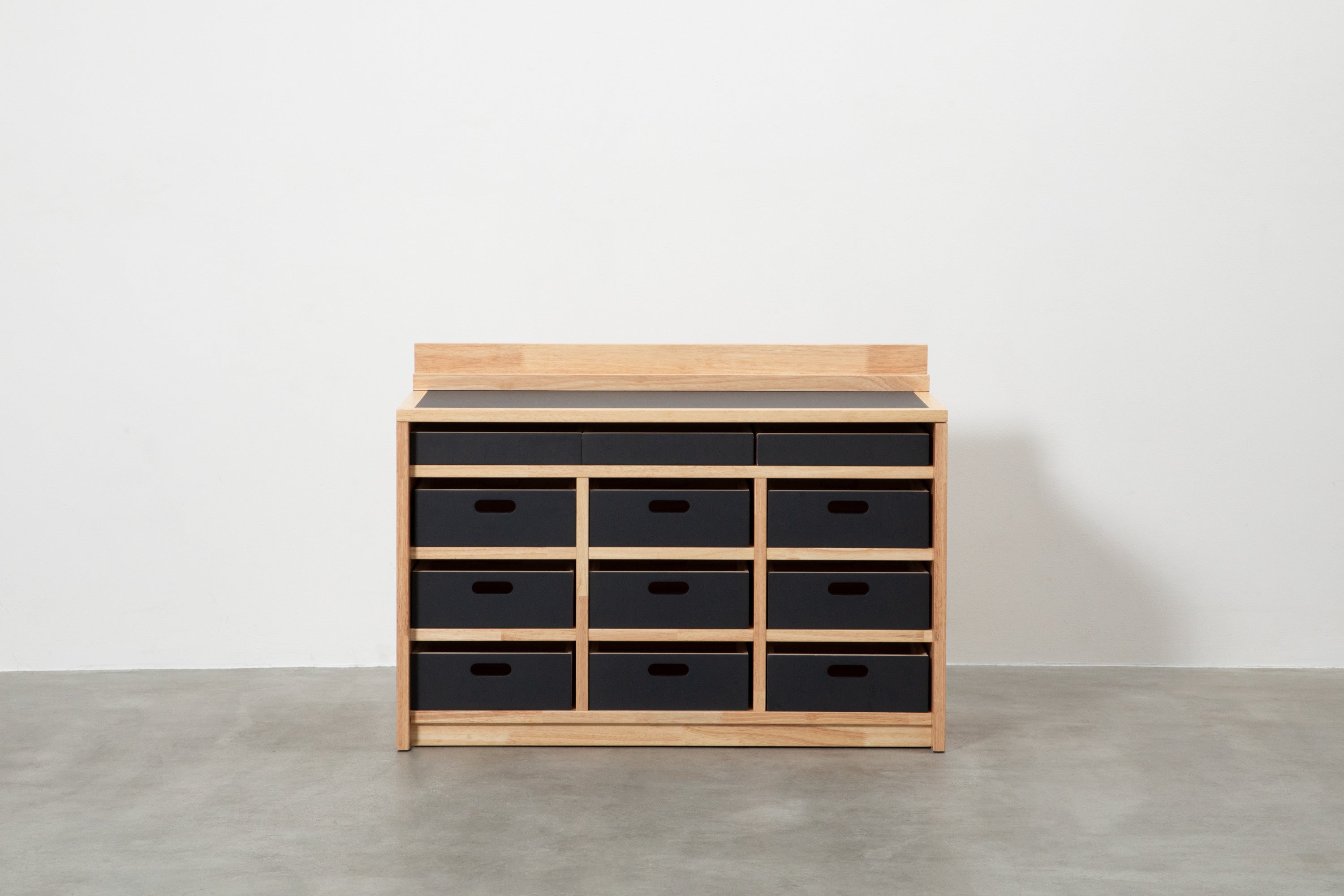 CHESTには、DESKとSHELFと共通デザインの浅型の引き出し3つと、深型の引き出し9つが取り付けられており、非常に高い収納力の家具となりました。ミニカーやブロック、ままごと道具のようなおもちゃだけでなく、保育園グッズや洋服の収納にも活用いただけます。