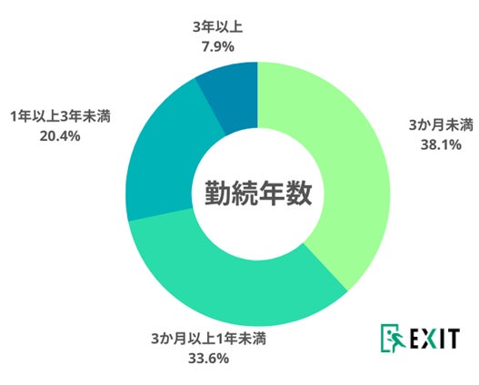 ・勤続年数が1年未満の利用者は約7割。勤続期間が3か月未満で退職する人は年々上昇傾向にある。