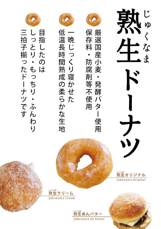 熟生ドーナツとは、口の中でとろけるようなふわもち食感の「生ドーナツ」の進化形で、生地を熟成させたことで、さらに、日本一、口の中でとろけるような食感を追求したドーナツです。