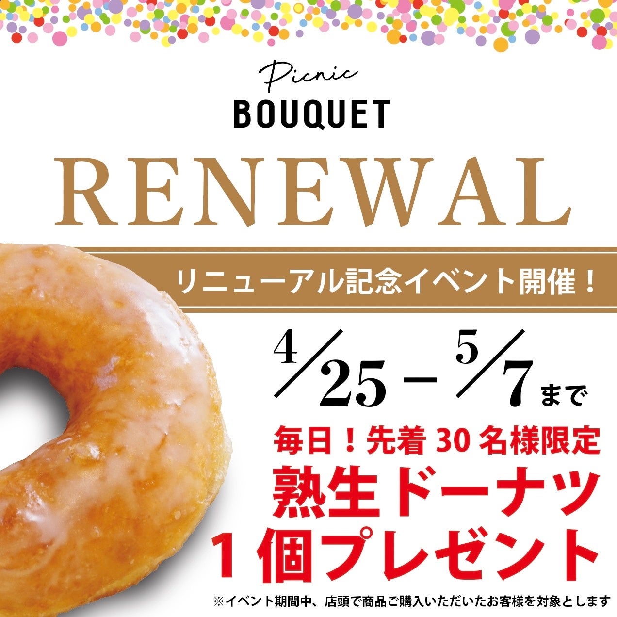 リニューアルオープンと熟生ドーナツの販売を記念して、GW期間含む 4/25(火)〜5/7(日)13日間、毎日、商品をご購入頂いたお客様先着30名様に熟生ドーナツを1個無料プレゼントするキャンペーンをおこないます。
