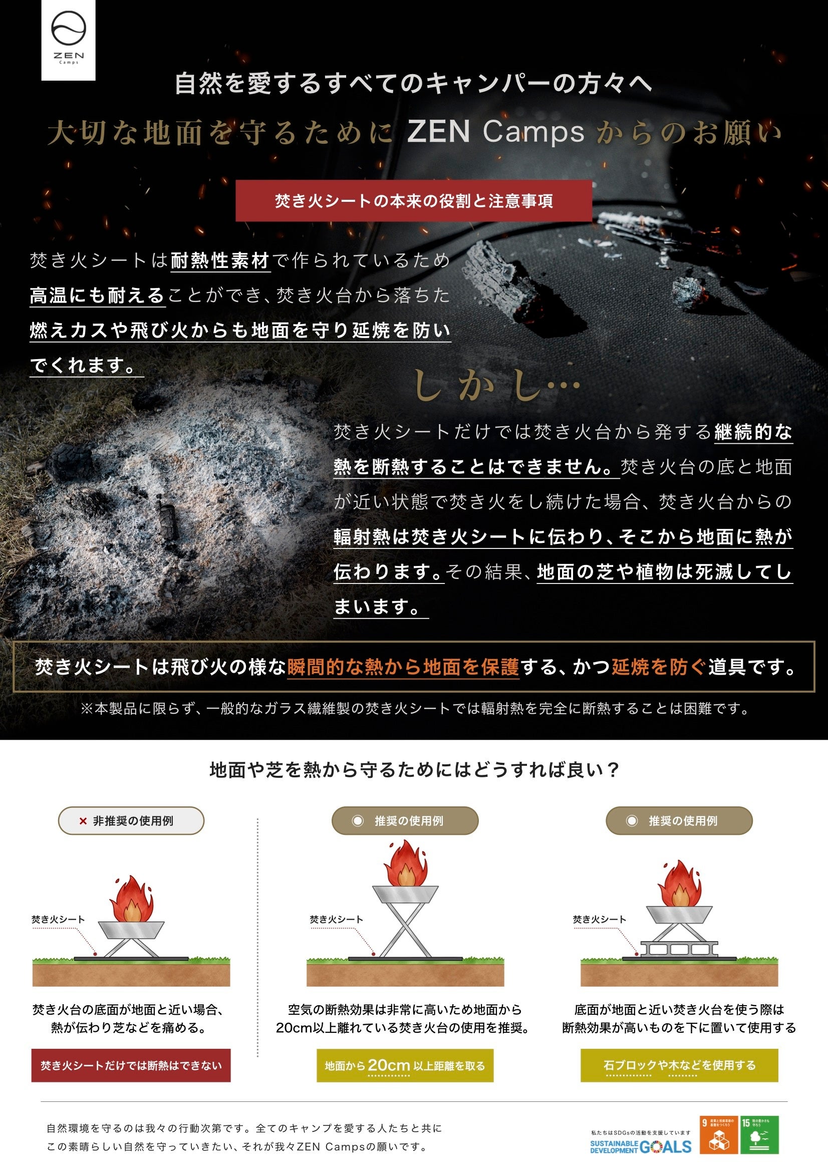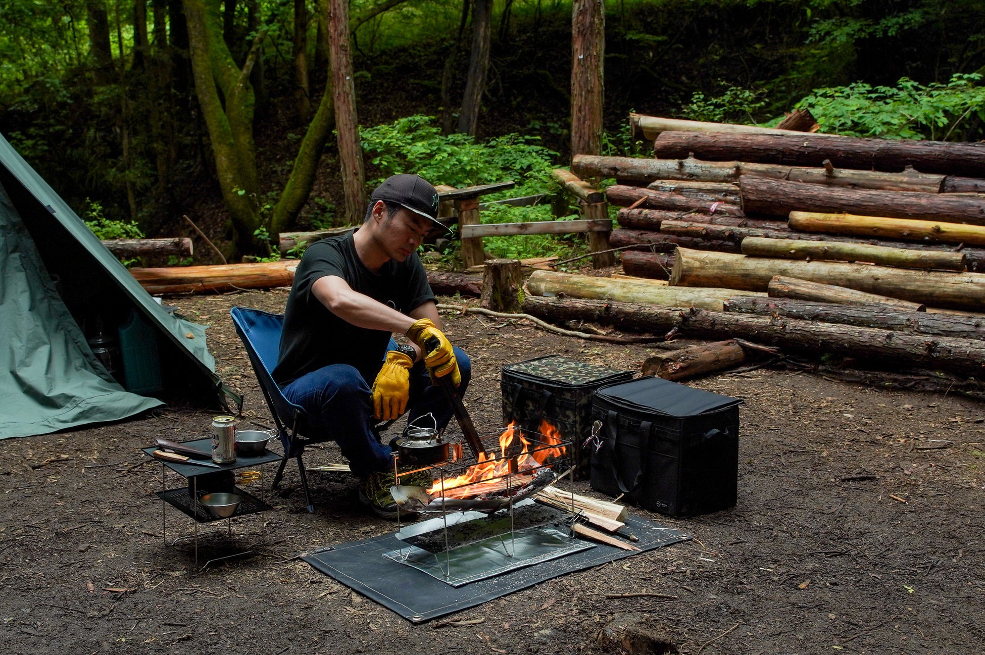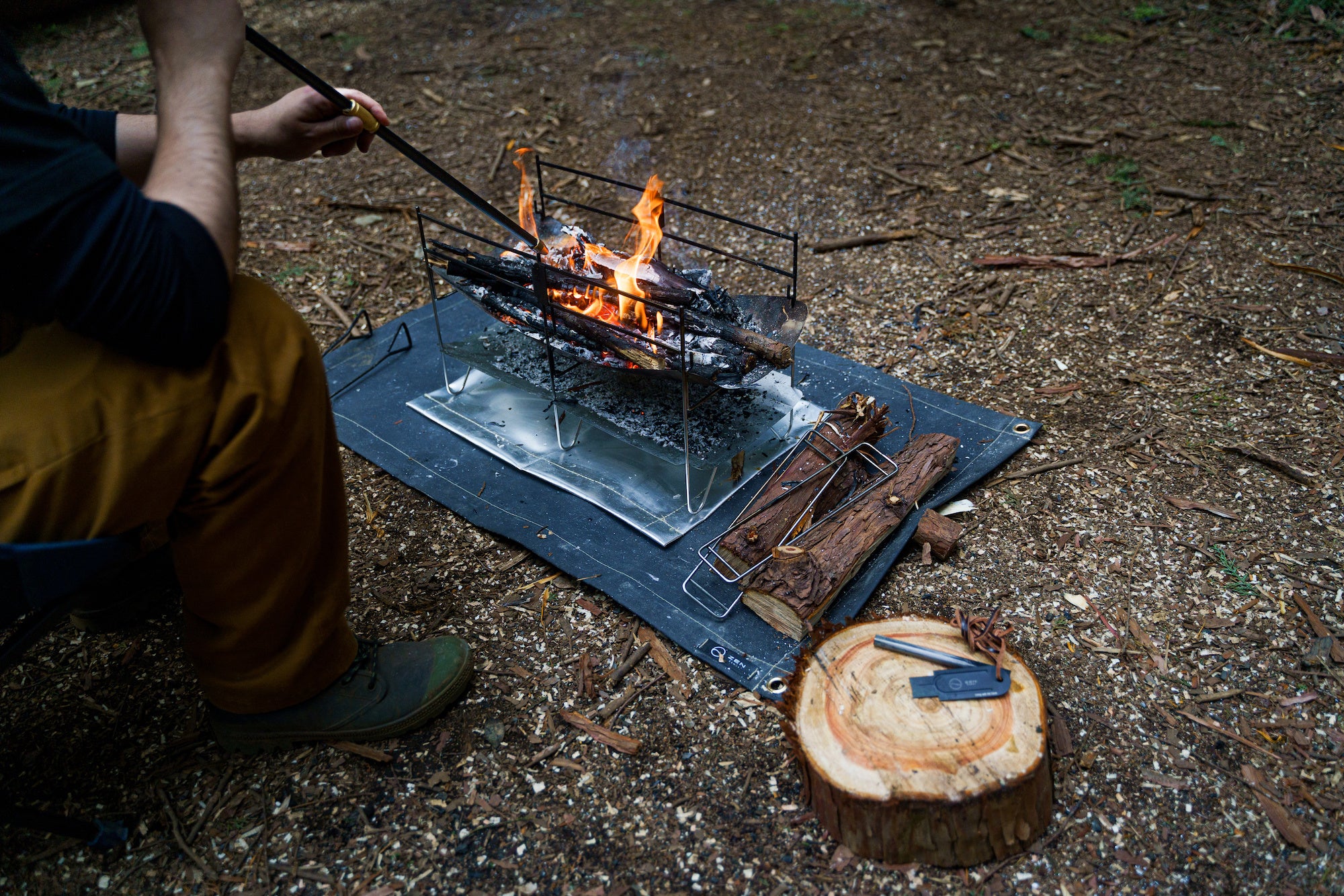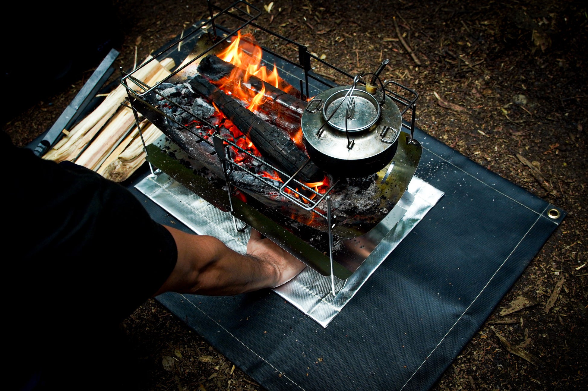 さらに消防士が使用する防護服から着想を得て、熱反射に優れたアルミ素材の遮熱シートも付属。これらにより地面にはほとんど熱の影響を与えない焚き火台となりました。