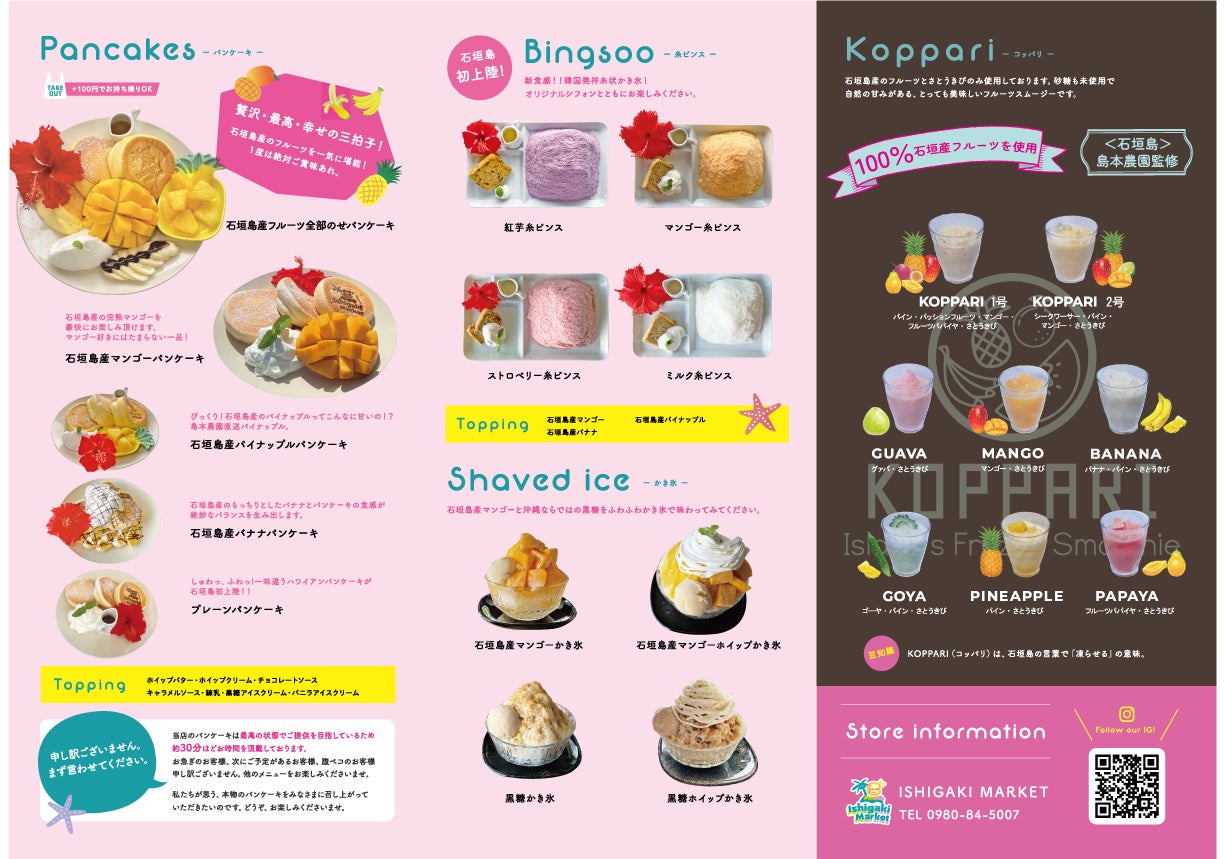 「ISHIGAKI MRKET」は2022年9月に沖縄県石垣市にオープンしました。代表者は石垣島が大好きでよく旅行に訪れており、その時に出会った方々とのご縁が重なって、長年の夢であった地でカフェをオープンするに至りました。石垣農家の全面協力を得て、パンケーキやスムージー等に使用するフルーツは全て石垣島で生産された最高品質のものを使用しております。またそのフルーツをより良い状態でお客様に提供するため、シーズンには生のもぎたてフルーツを、シーズンオフには旬の時期に収穫したフルーツを独自の特殊冷凍技術で品質維持したフルーツをパンケーキや他のスイーツと共にお楽しみいただけます。