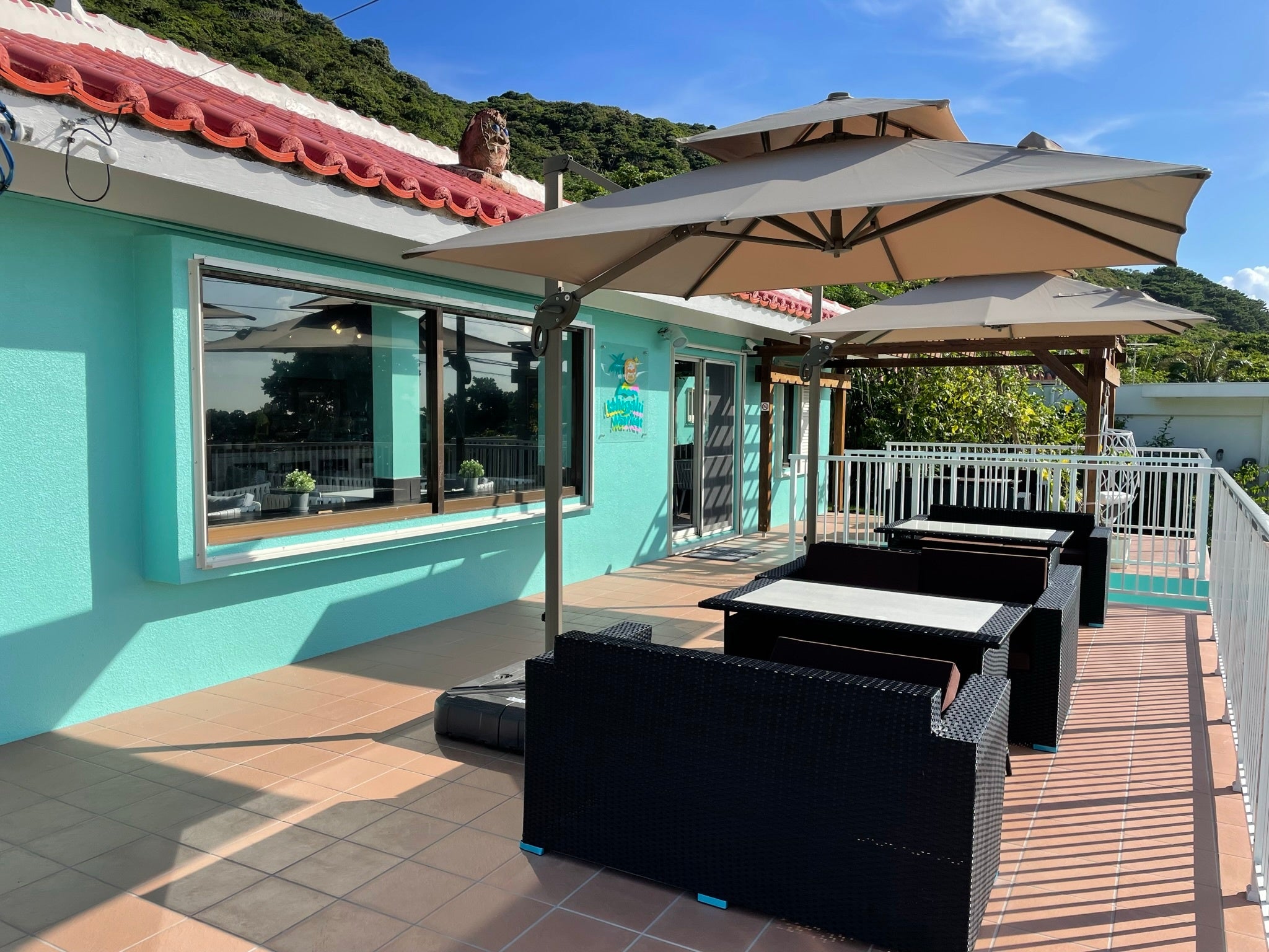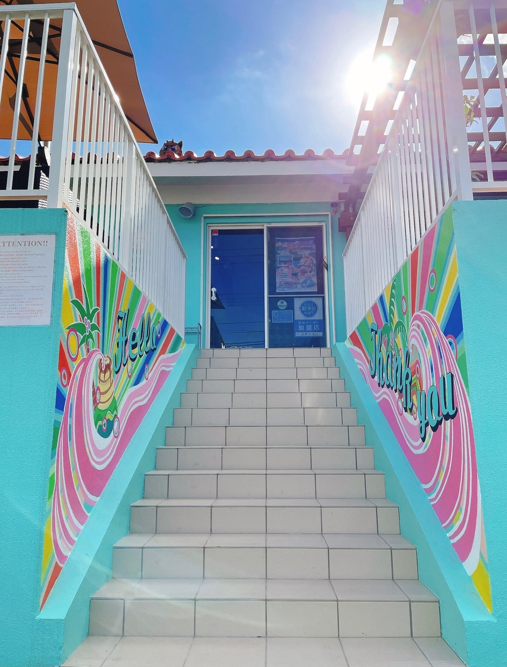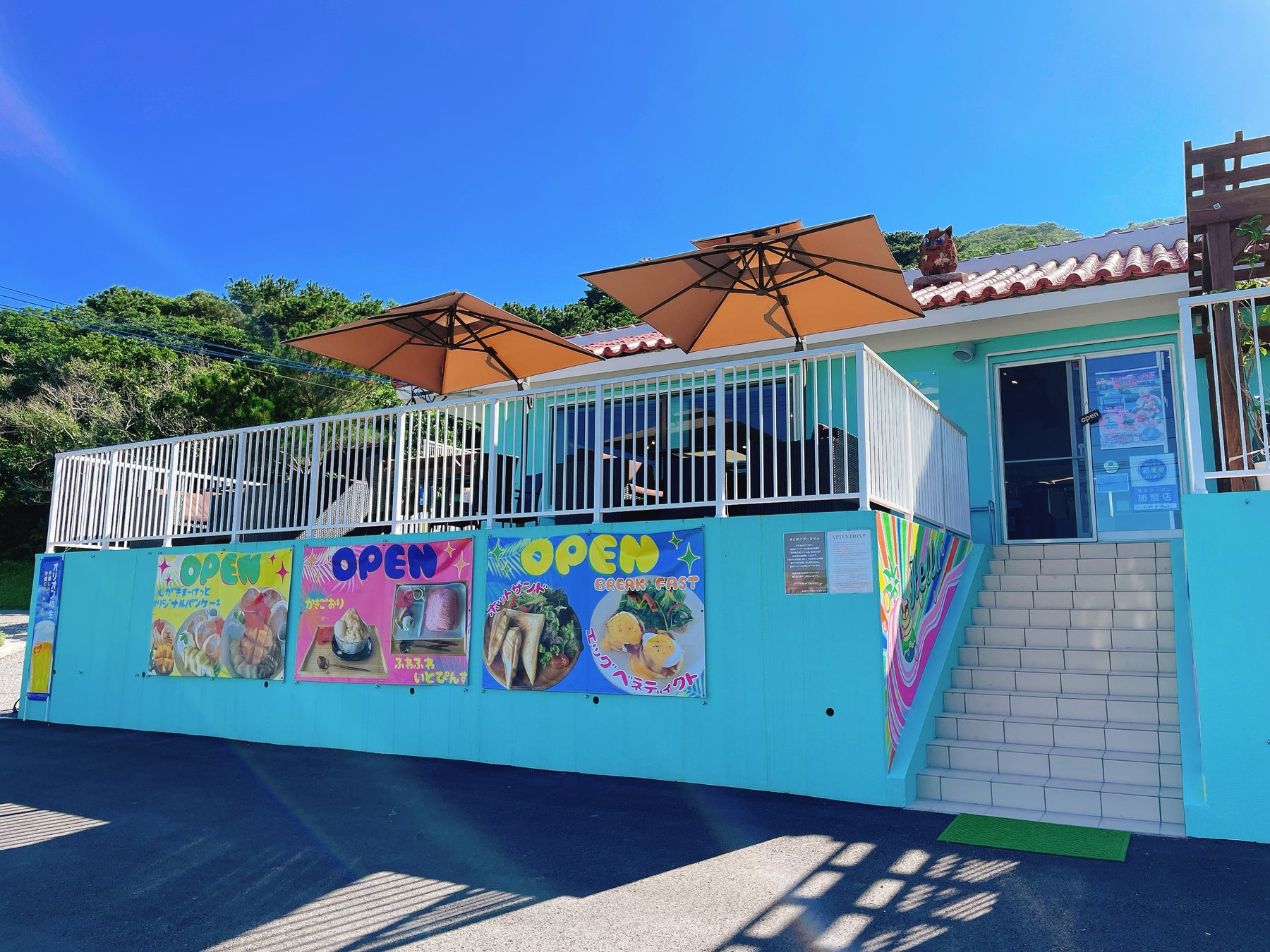敷地内にインスタ映えスポットあり、2階へ上がると海が一望できる絶景ロケーション!パンケーキ・ガーリックシュリンプ・ドリンク等、テイクアウト可能☆