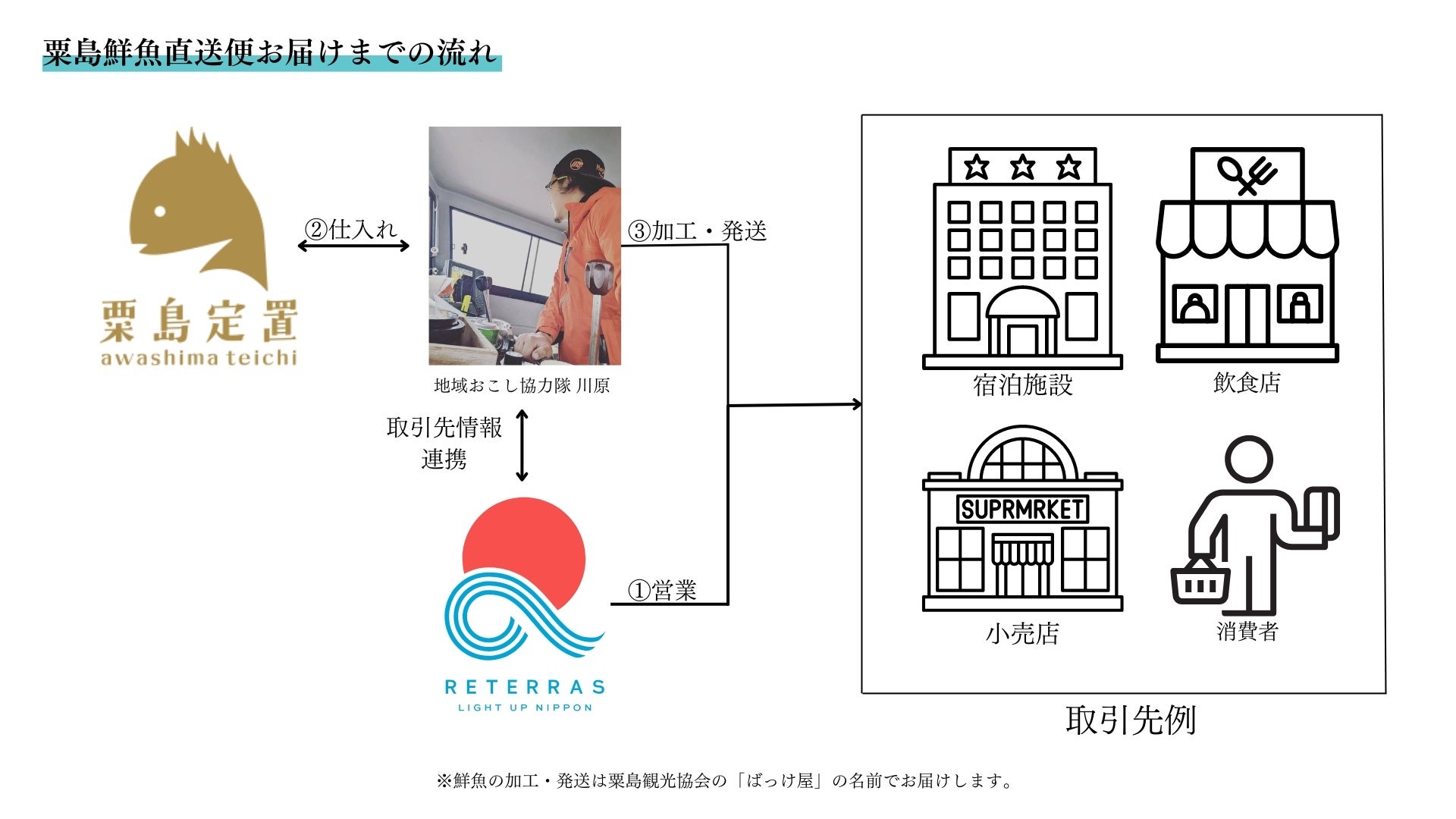 リテラスは、粟島浦村の漁師の新たな販路開拓に加えて、取引先様1件1件と信頼関係を築き、粟島の鮮魚を通じて、取引先様のお客様が喜んでいただけるように、取引先様と粟島の双方のファンを増やすことで、同村主要産業である漁業への貢献だけでなく、粟島の関係・交流人口増加にも寄与できる活動を推進してまいります。。