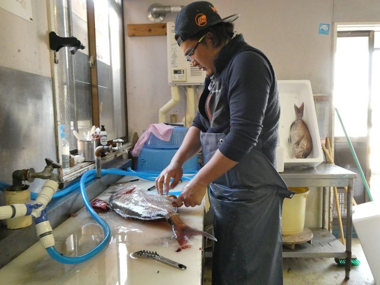 2.地域おこし協力隊で本サービスの現場責任者である川原が目利きした厳選された鮮魚を究極の血抜きと呼ばれる「津本式」(※5)で下処理処理加工をしています(津本式公認取得済)