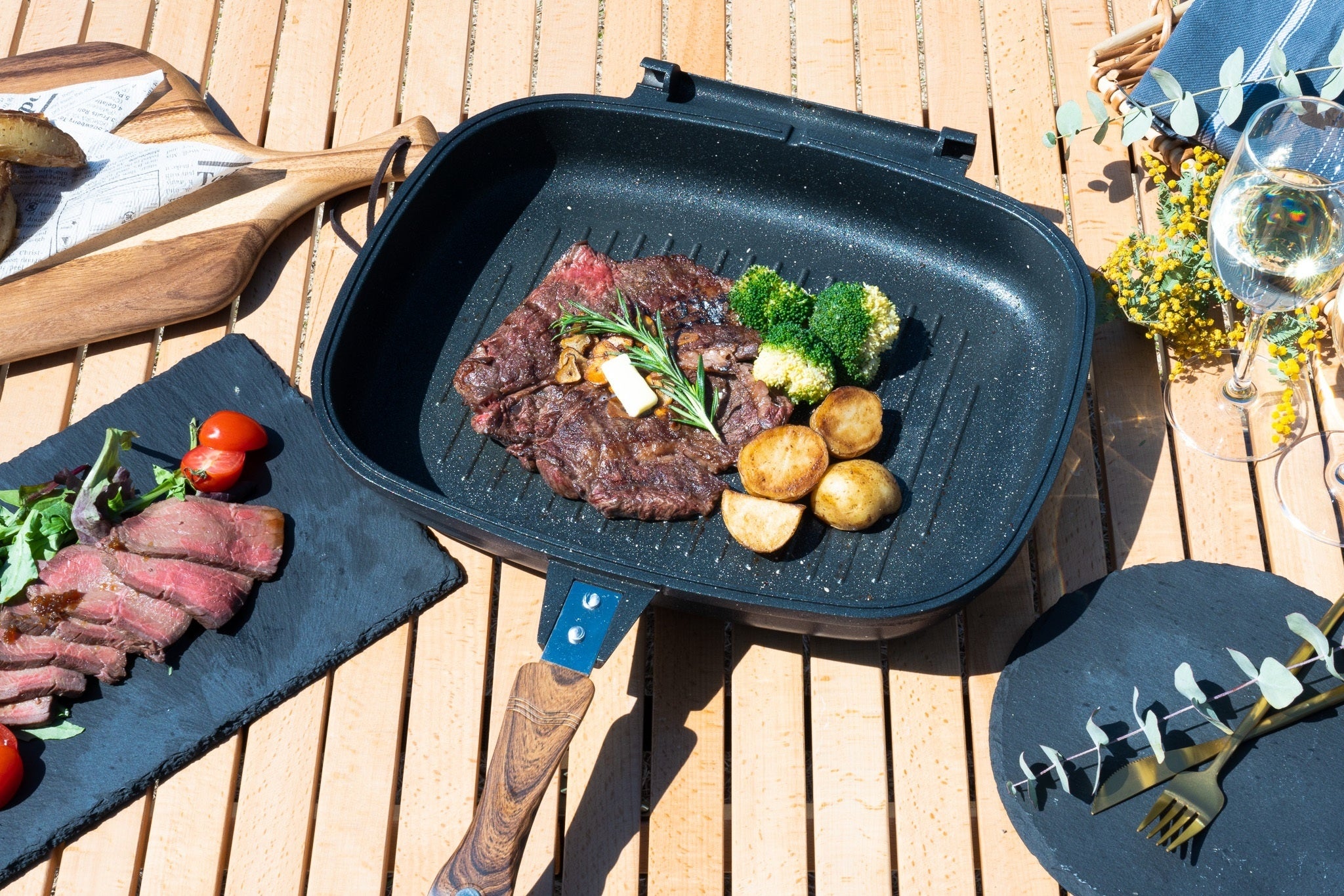 DOUBLE GRILL は素敵なデザインで、料理のみならずキッチンのインテリアにも最適です。もちろん料理に関しては上下のフライパンで旨みを凝縮して閉じ込める事で普通のフライパンより何倍にも美味しさが増します。