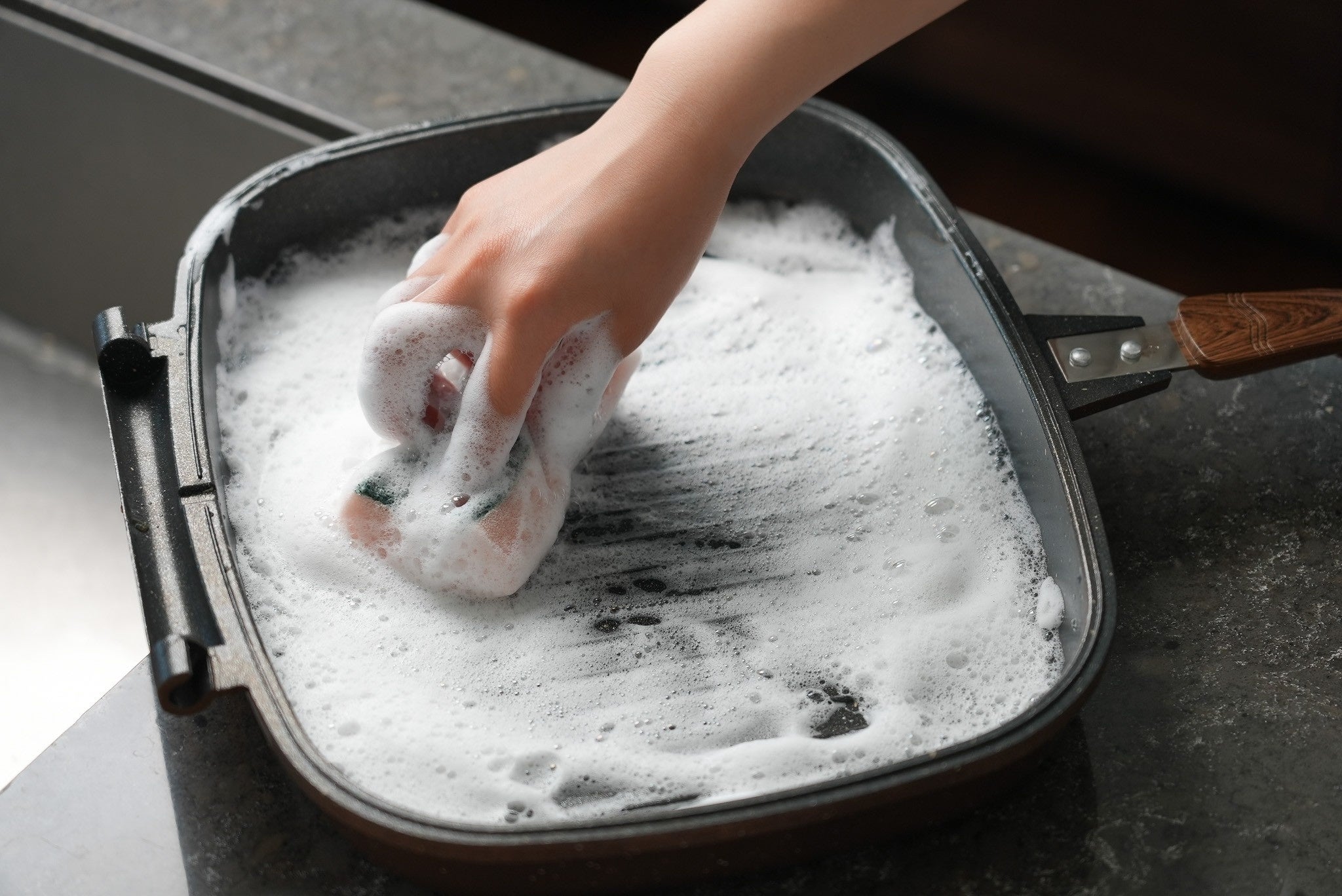 マーブルコートは一般的なフッ素樹脂に石粉を混ぜているため、フッ素樹脂だけのノンスティック加工に比べ、表面が硬く耐摩耗性に優れているのも特徴。