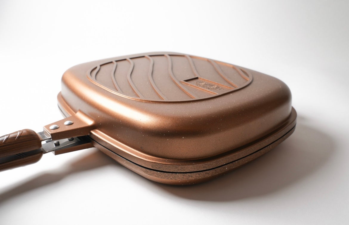 DOUBLE GRILL は弱い火力でも素早く調理ができるチタンコーティングのダブルパンです。