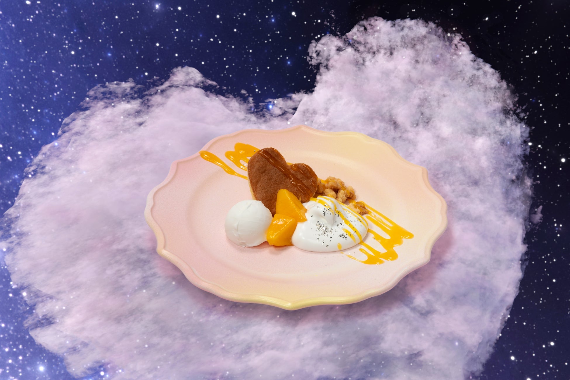 可愛らしいハート形のパンケーキに、ひんやり冷たいジャージーアイス、ココナッツクリーム、マンゴーの果肉とソースを添えて提供します。口の中で弾けるパチパチとしたキャンディの食感が楽しい一皿です。