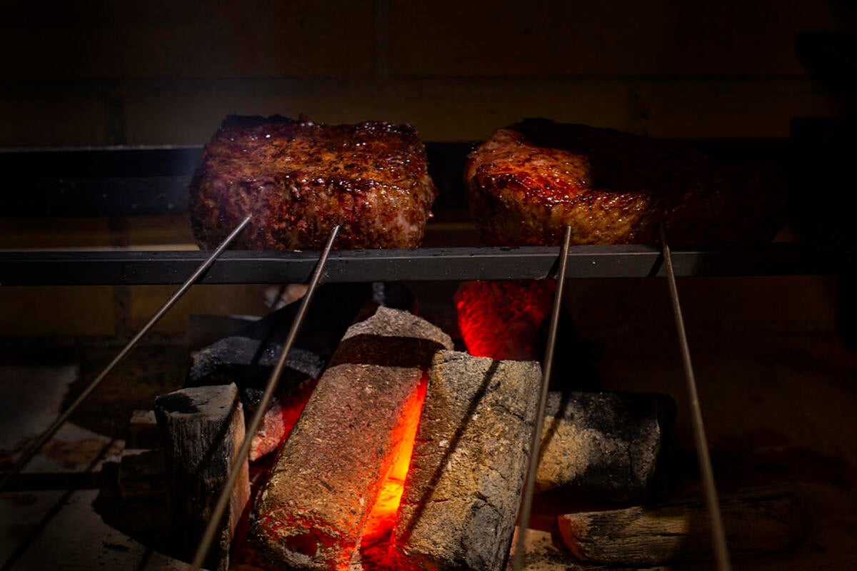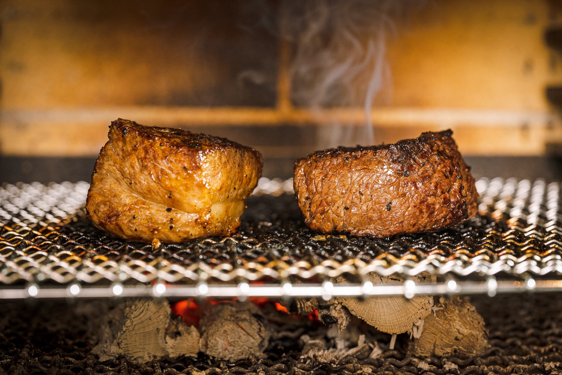 特徴は高温になる炭の直火や遠赤外線による輻射熱、そしてレンガの蓄熱による対流熱によって、炉内全体を高温に保ちオーブンのような状態にすることで、肉に対して高温かつ均一な火入れが可能になります。赤外線の輻射熱は表面を均一に素早く焼き上げて食材を硬化させるため、内部のうま味を閉じこめ、表面がパリッとした焼上がりになり、内部はとてもジューシーに仕上がります。それによってドリップや旨味が零れ落ちないので、旨味が凝縮されて美味しく感じられ、至高のステーキが完成します。