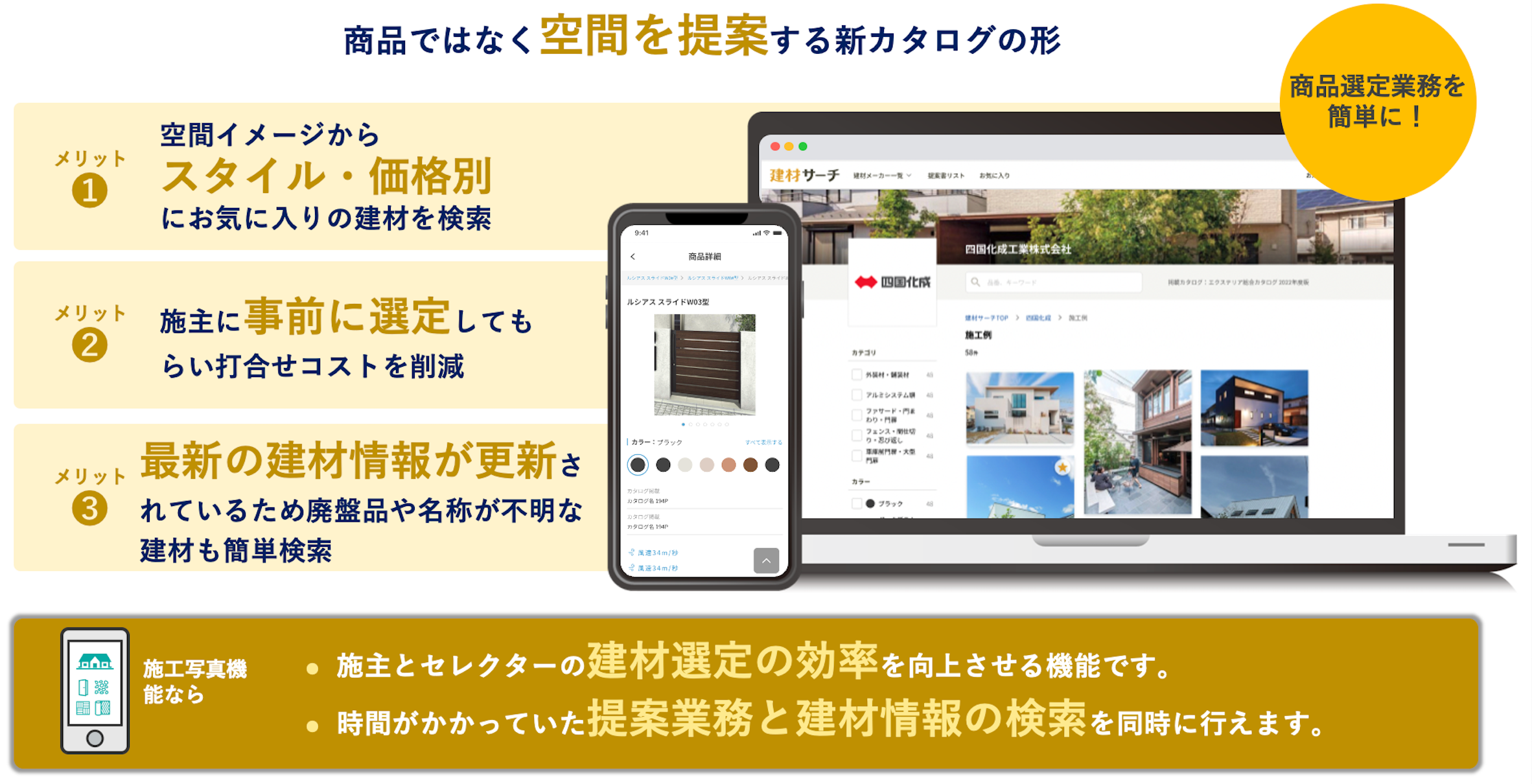 施工写真から使用建材の詳細情報や別の使用例も確認できるほか、お気に入り画像から販売工事店とのマッチング・施工依頼まで可能です。また、従来時間がかかっていた提案業務と建材検索が同時におこなえるので、施主とプロユーザーの建材選定の効率が向上し、打ち合わせ等にかかるコストを削減できます。