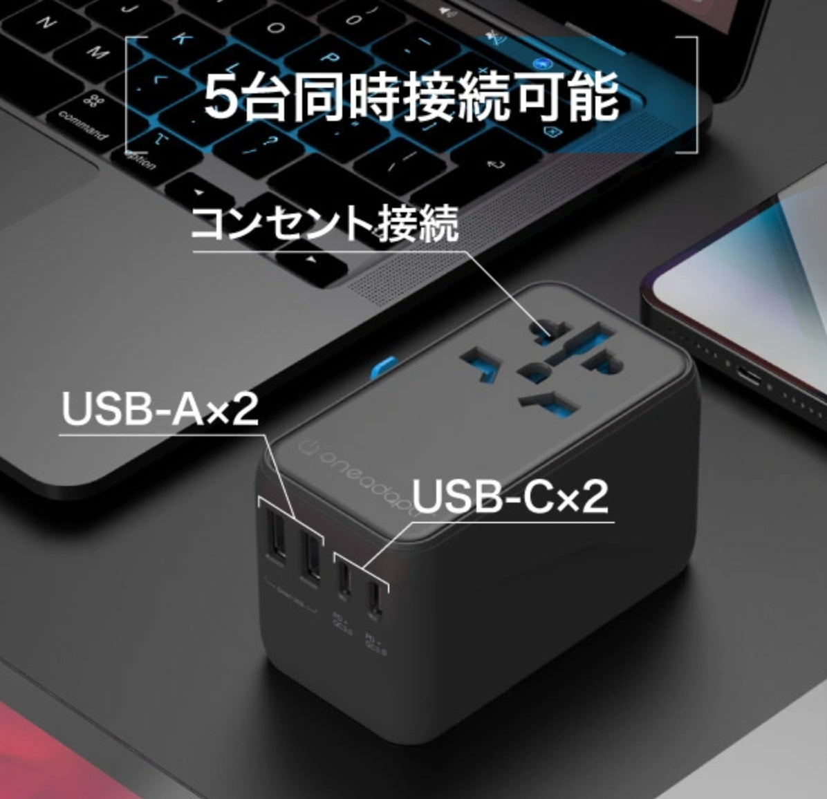 OneWorld100は複数のコンセントソケットに加え、USB typeAポートが2つ、USB typeCポートが2つの合計5つの接続口を完備し、最大で同時に5台のデバイスの給電・充電が可能です。