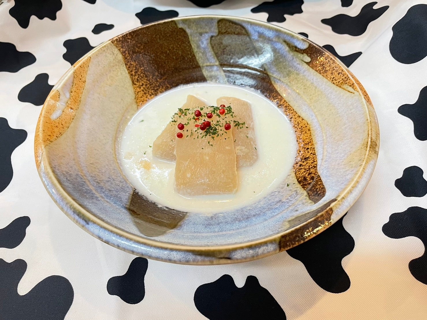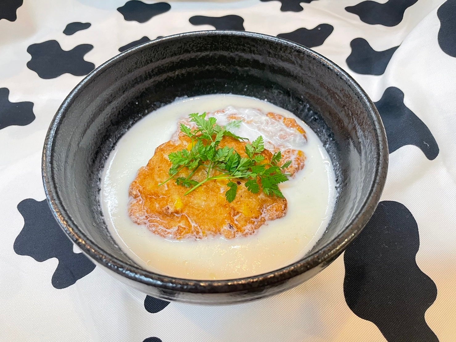 牛乳の大量廃棄問題で「泣く泣く廃棄している」現状で地元に何かできないかと道産子大将渾身の逸品です。おでん定番タネの「大根」や「たっぷりコーンのさつま揚げ」はフレンチコースのような見た目で普段のおでんよりより濃厚になりました。