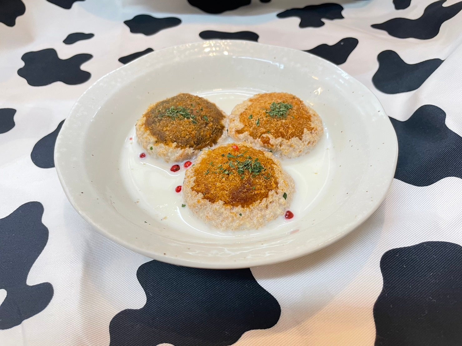 ライスコロッケの中身はトマトリゾット、チーズ、イカ墨の3種類でそれぞれトマトリゾットはトマトの酸味や甘みが加わり、深みのある味わいです。チーズはチーズの風味が豊かで、まろやかな味わいに、イカ墨は濃厚で海の香が楽しめてサクッからのじゅわっと旨味が溢れる1品で3種の味が楽しめます!