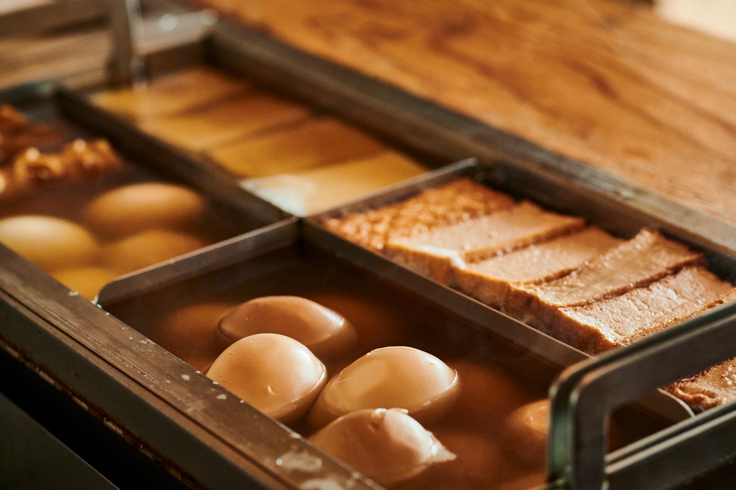 「出汁と旬食材をこだわればおでんは365日美味い」がコンセプトで自慢のオリジナル鱧出汁は様々な食材を活かし食材の旨味と融合し『出汁までおいしく飲めるおでん』に仕上げています。 こだわりの卓上の薬味 (特製濡れ一味、柚子胡椒、辛子、メリッサ) お通し代わりに提供するオリジナル薬味 ( ねぎ醤油と山わさび ) で お客様好みにカスタム、それぞれのタネにあった薬味の使い分けで楽しみ方を演出しています。