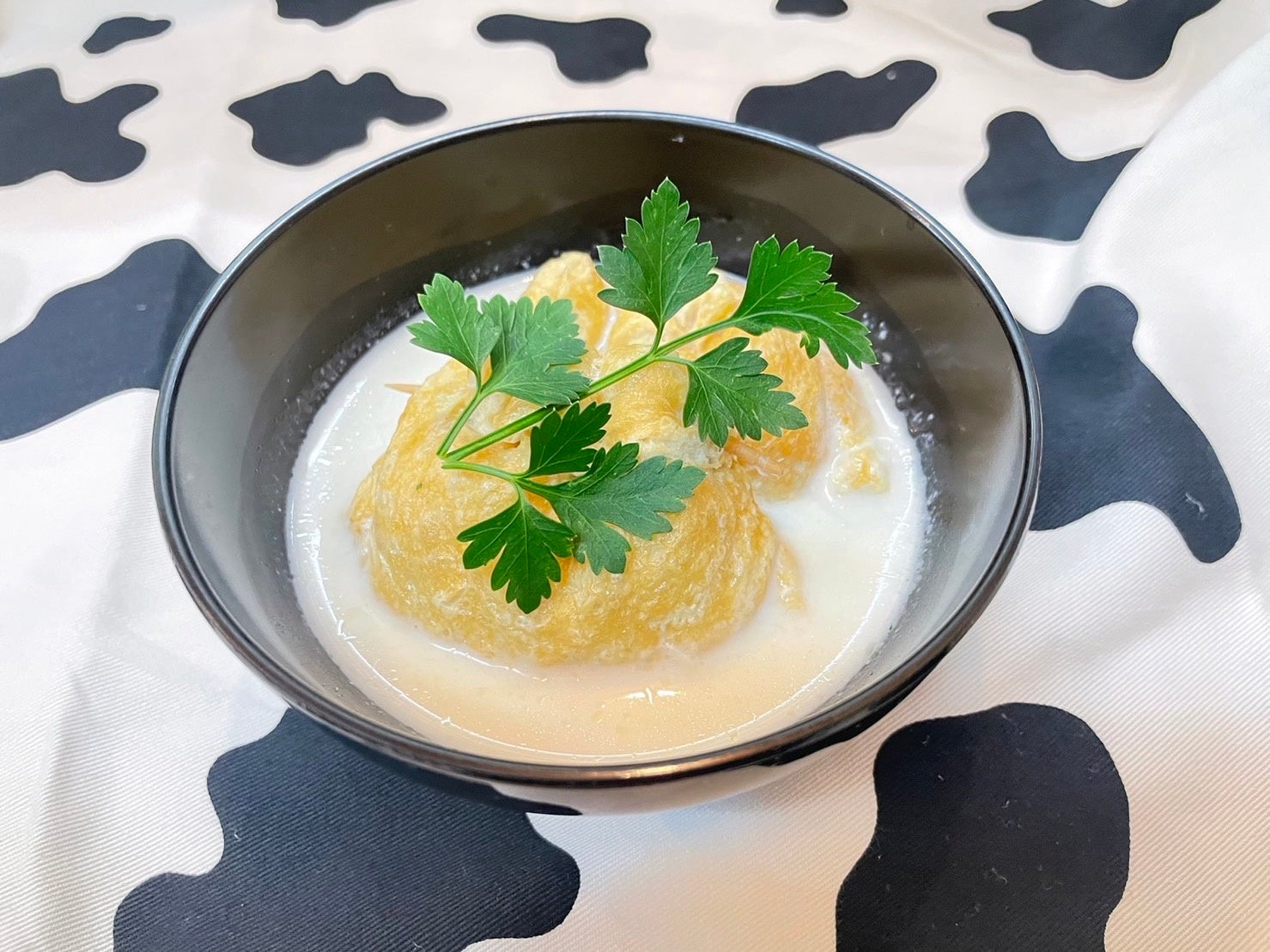 巾着の中にはお餅ではなくカマンベールを入れた一品です。 チーズの塩っけと巾着にしみこんだ牛乳出汁が深まり、さらにまろやかでコクのある味わいになります。