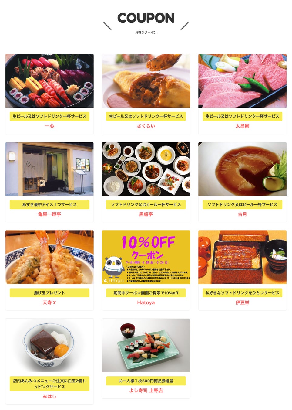 4/26(水)〜5/19(金)の期間中、下記店舗にて公式サイトのクーポンページを表示した画面、またはクーポンページの印刷をご呈示いただけますと各種サービスが受けられます。