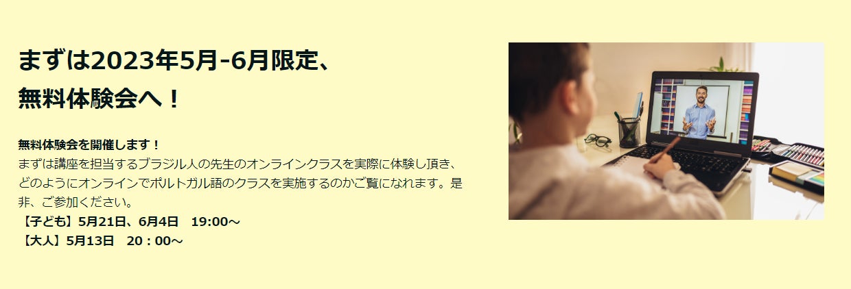 初回クラスは、社会人は2023年5月17(水)から、小学生は夏休み期間の7月25日~(れぞれ3日前まで申込み期限)をご用意し、2023年5月-6月限定で「無料ポルトガル語講座体験会」を開催を予定しています。