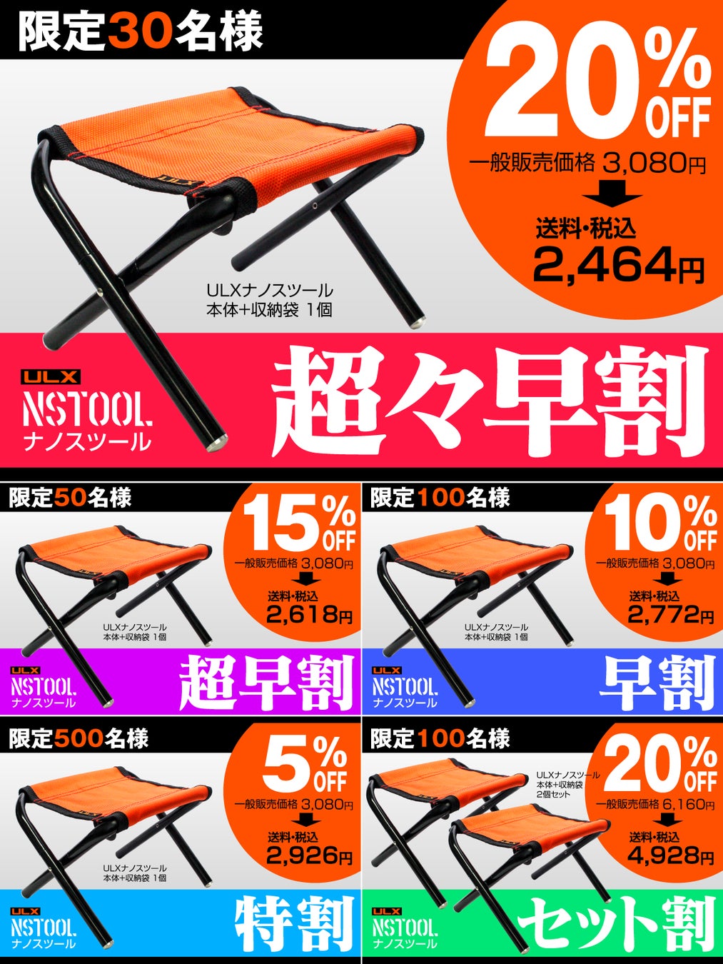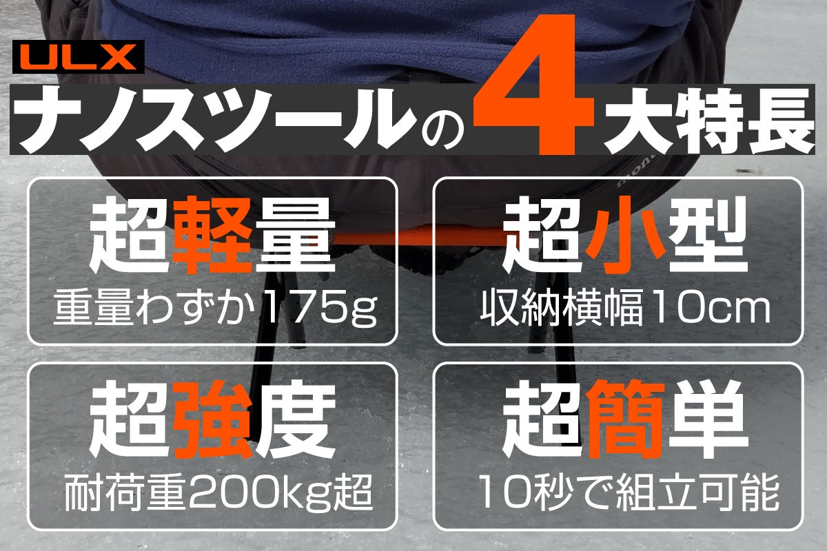 このULXナノスツールを皮切りに、軽量かつ機能的で何がなんでもフィールドに持っていきたくなるアウトドアギアを提供していきます。