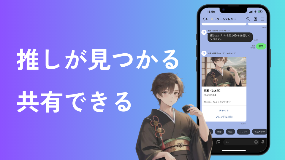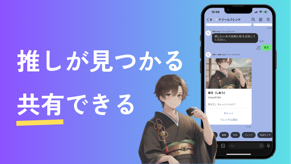LINEで友達追加をすることで利用ができ、好きなキャラクターを選択するだけで、キャラクターと会話ができます。AIの作成では、キャラクターに記憶や口調、性格などの情報を与えることで、精度高くキャラクターの再現が可能です。