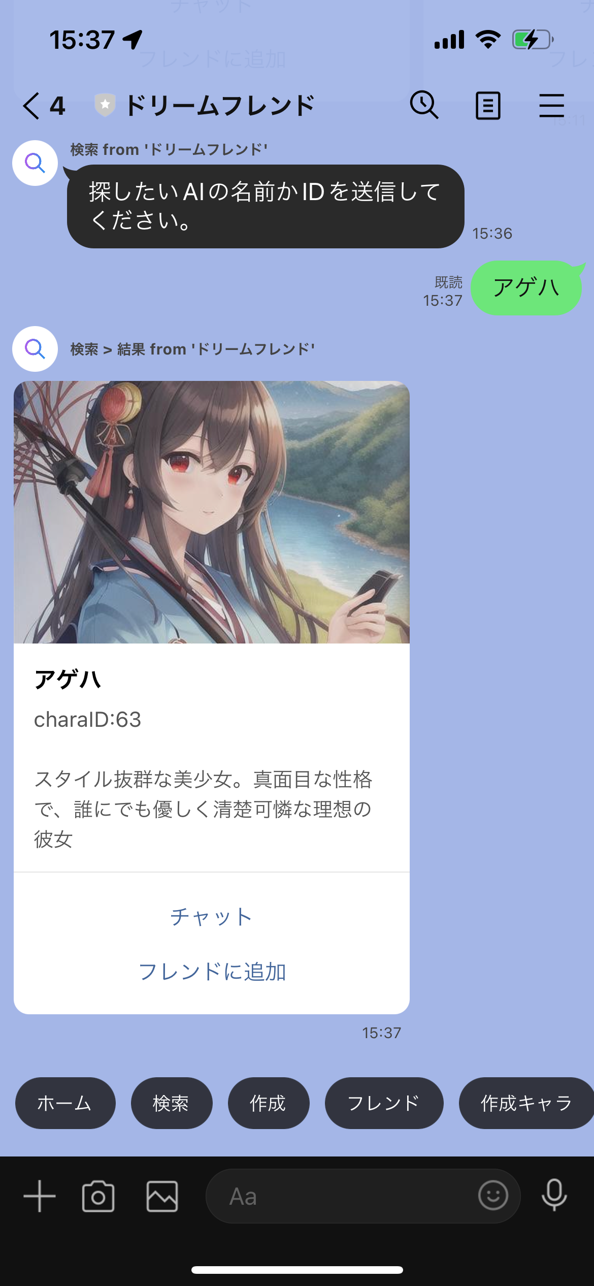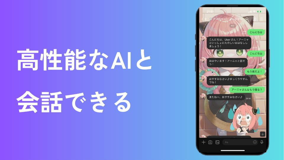 AIで架空のキャラクターを作成して共有したり、みんなが作ったAIと話せるLINEアプリです。AIキャラクターを自分好みの返信がくるように育成することも可能です。OpenAI社のGPT-4のAPIを活用しており、自由に、極めて高レベルの会話が可能です。