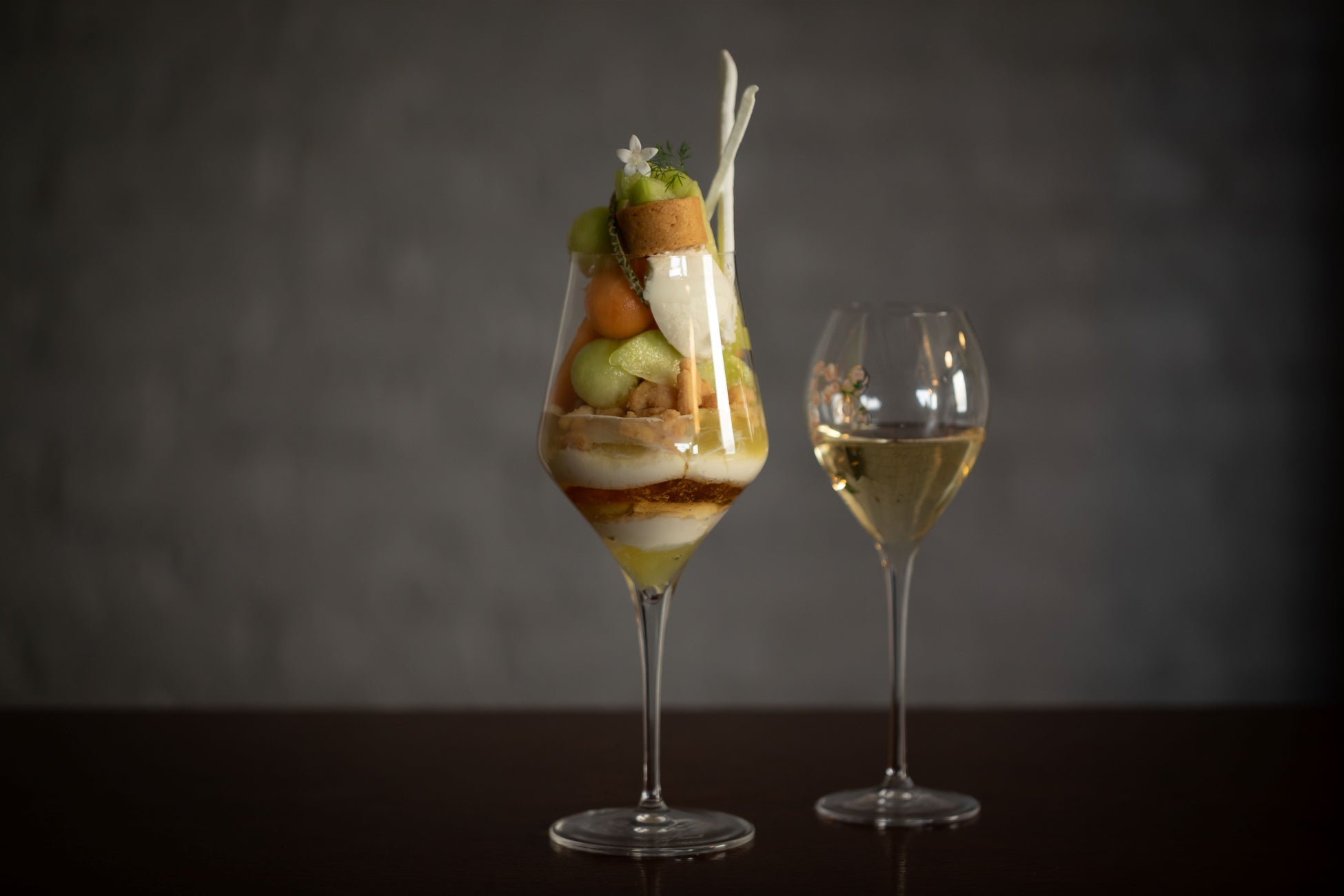生のメロン、メロンジュレ、シャルドネジュレを重ね、エルダーフラワーにて全体に軽やかさを演出いたしました