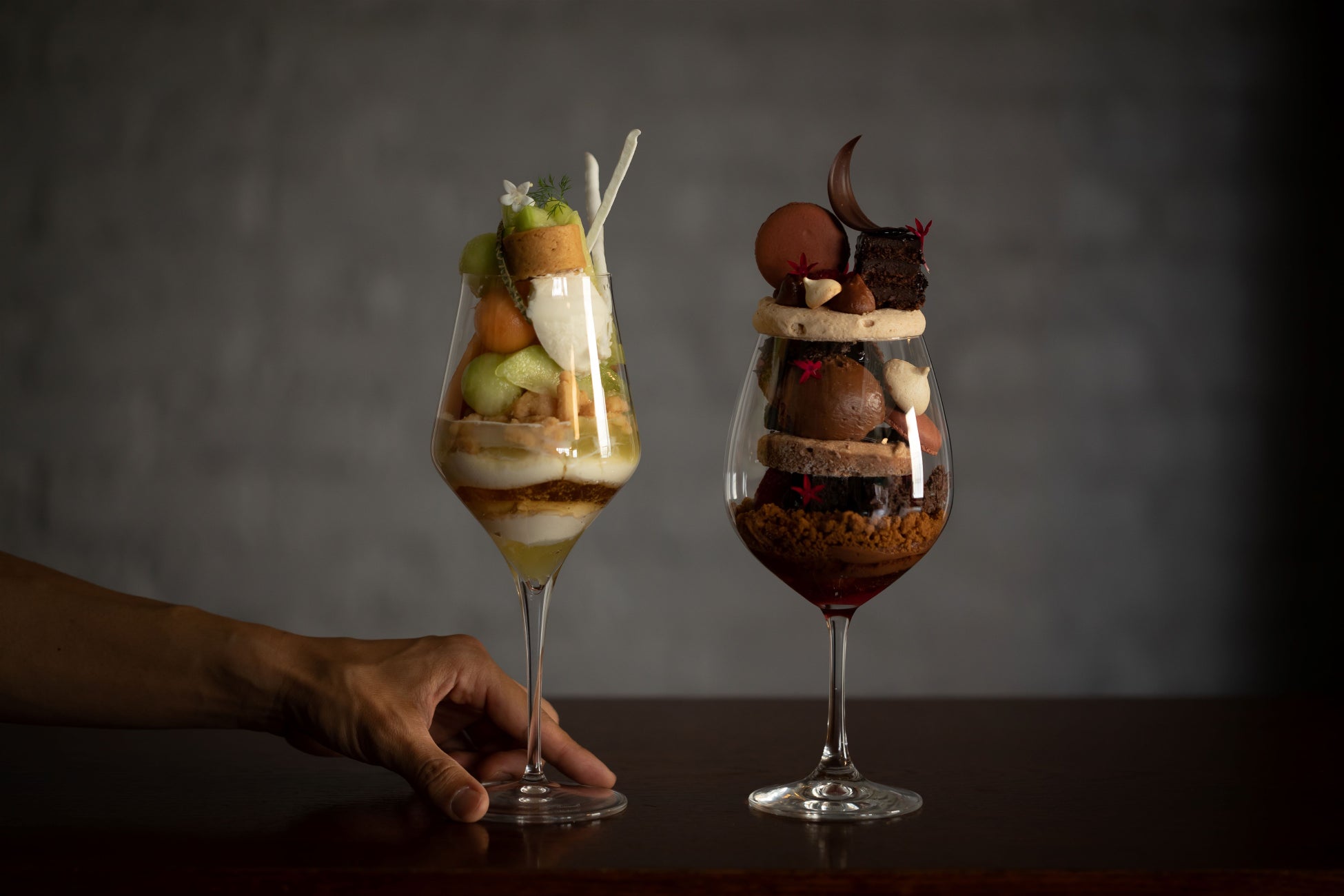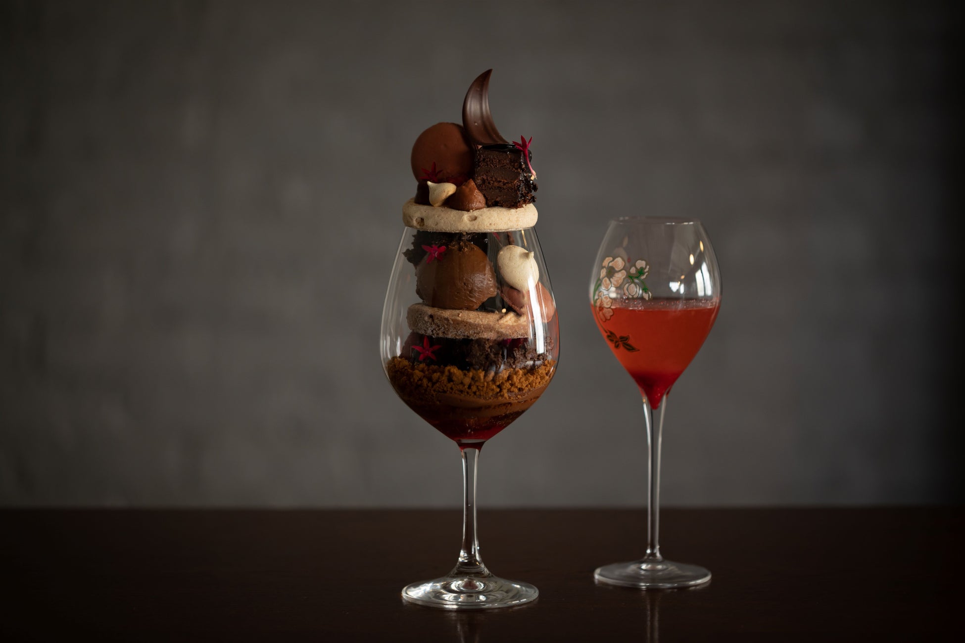 「キール・アンぺリアル」は、シャンパーニュをベースにフランボワーズを合わせたカクテル。「黒のパフェ」の重なり合うチョコレートの味わいを、「キール・アンぺリアル」の甘酸っぱく、そしてすっきりとした味わいで包み込みます