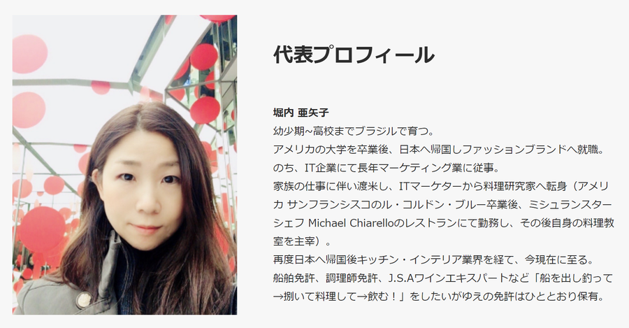 家族の仕事に伴い渡米し、ITマーケターから料理研究家へ転身(アメリカ サンフランシスコのル・コルドン・ブルー卒業後、ミシュランスターシェフ Michael Chiarelloのレストランにて勤務し、その後自身の料理教室を主宰)。再度日本へ帰国後キッチン・インテリア業界を経て、今現在に至る。船舶免許、調理師免許、J.S.Aワインエキスパートなど「船を出し釣って→捌いて料理して→飲む!」をしたいがゆえの免許はひととおり保有。