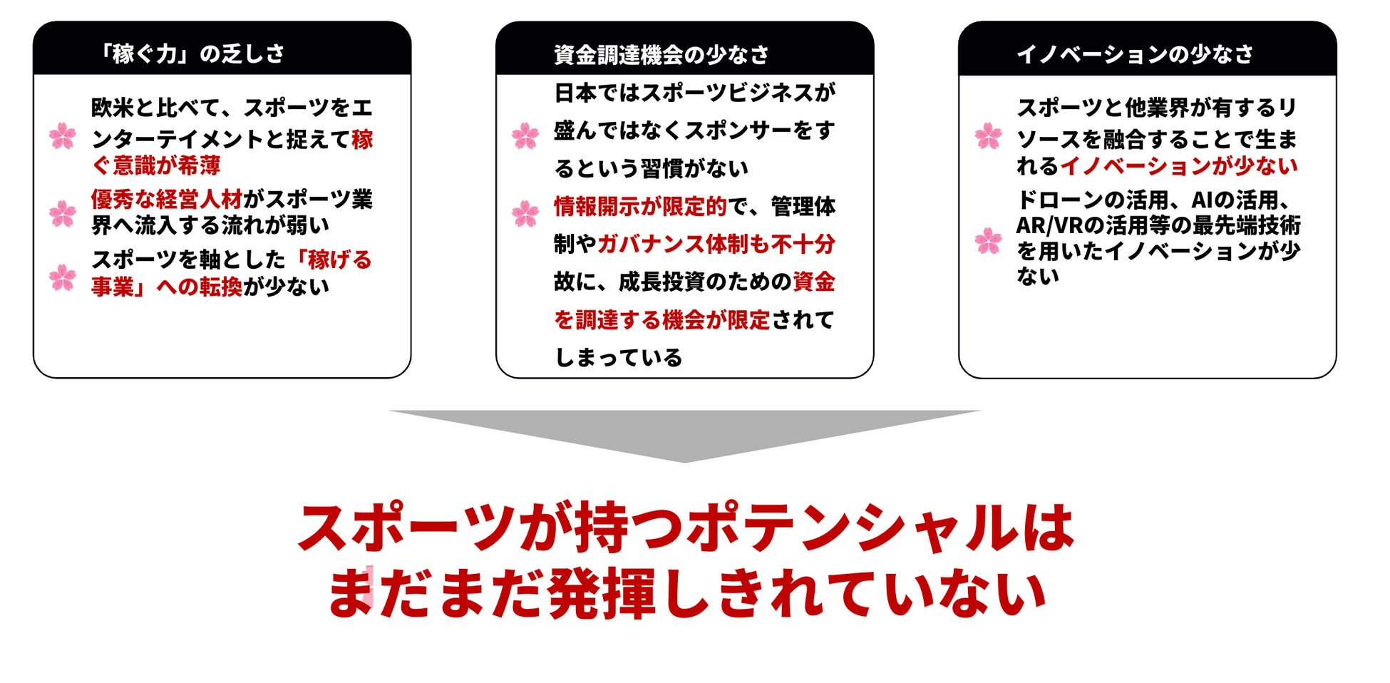スポーツ業界は、 スポーツを基軸として 様々な業態・業種の事業を展開する ⼤きなポテンシャルを秘めているものの、日本では市場規模が5兆円とまだまだスポーツが持つポテンシャルを発揮できていない。