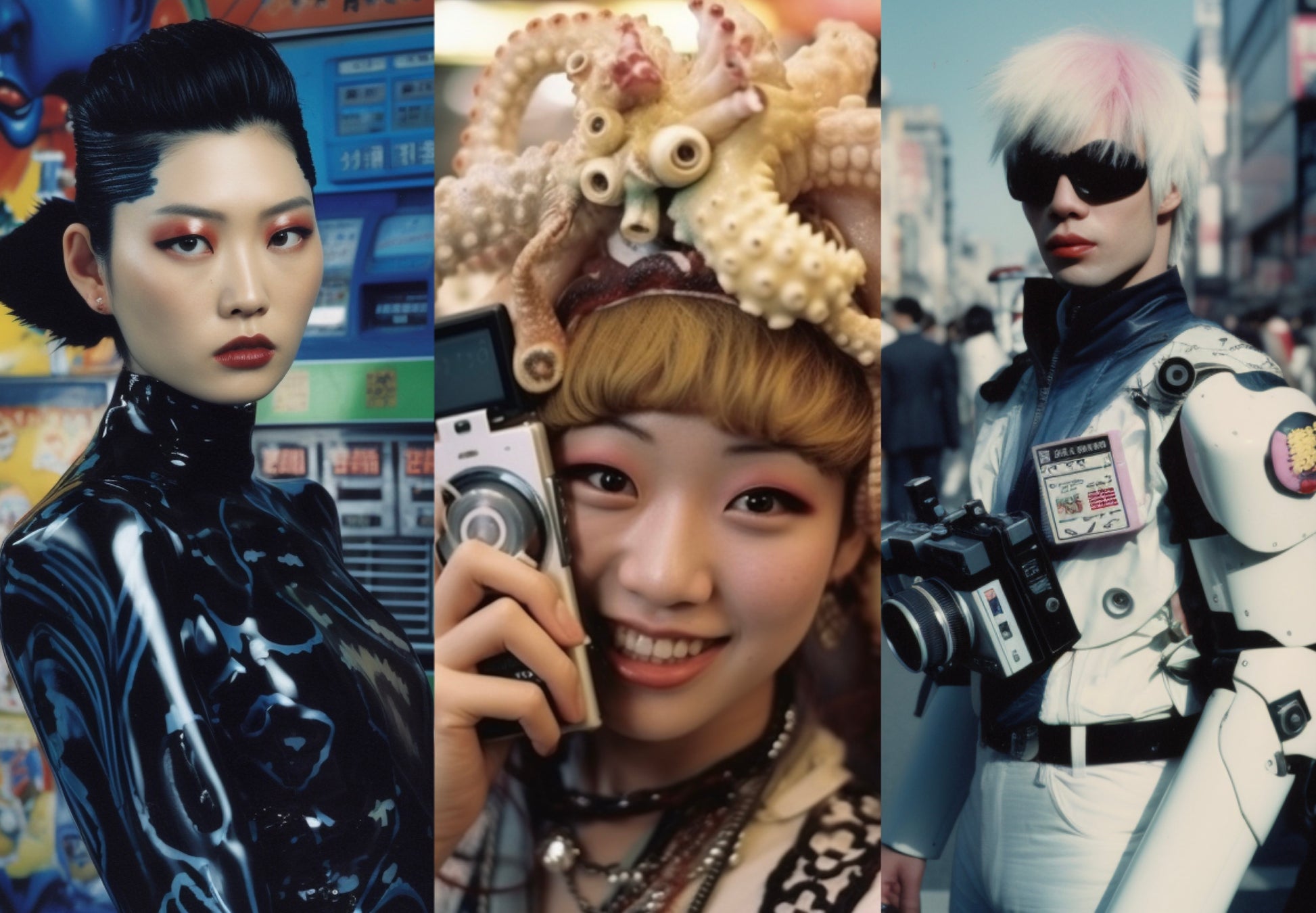 存在したかもしれない日本の若者文化をパラドクス的に描いたストリートスナップ「NeuralFad」は、画像生成AIを用いて様々な時代背景や要素を掛け合わせて構成されています。昔ながらのノスタルジックな見た目とモダン要素が交わる幻想的なデザインが特徴です。人工知能を通じて東京の豊富なストリートファッションの語彙や歴史を再解釈し、1940年代のモガやモボから、風天族、90年代のカラス族、ギャルやデコラファッション、そして200年代初頭の東京ストリートファッションまで、時間を超えた想像上の東京ストリートファッションを映し出します。