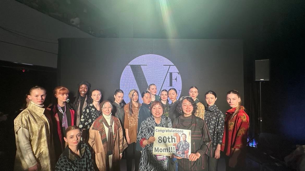 コロナ禍でも着物リメイク服の販売を継続しようと、2022年8月からInstagramアカウントを開設したところ、バンクーバーファッションウィークに出演依頼の問い合わせがありました。「80歳だからこそ最初で最後のチャンスだ」と、家族の応援を受けて出演を決意します。準備を着々と進めていきましたが、体調不良でショー当日に向けた渡航を断念。義理の娘が代理で行くことに。彼女はサプライズボードを用意し、ショー出演をお祝いしました。