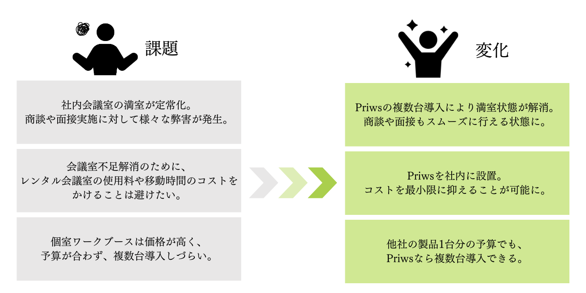 現在、東京本社で4台導入しています。9時〜18時の就業中は商談や面接等のオンライン会議の利用で、Priwsは社員から大人気です。