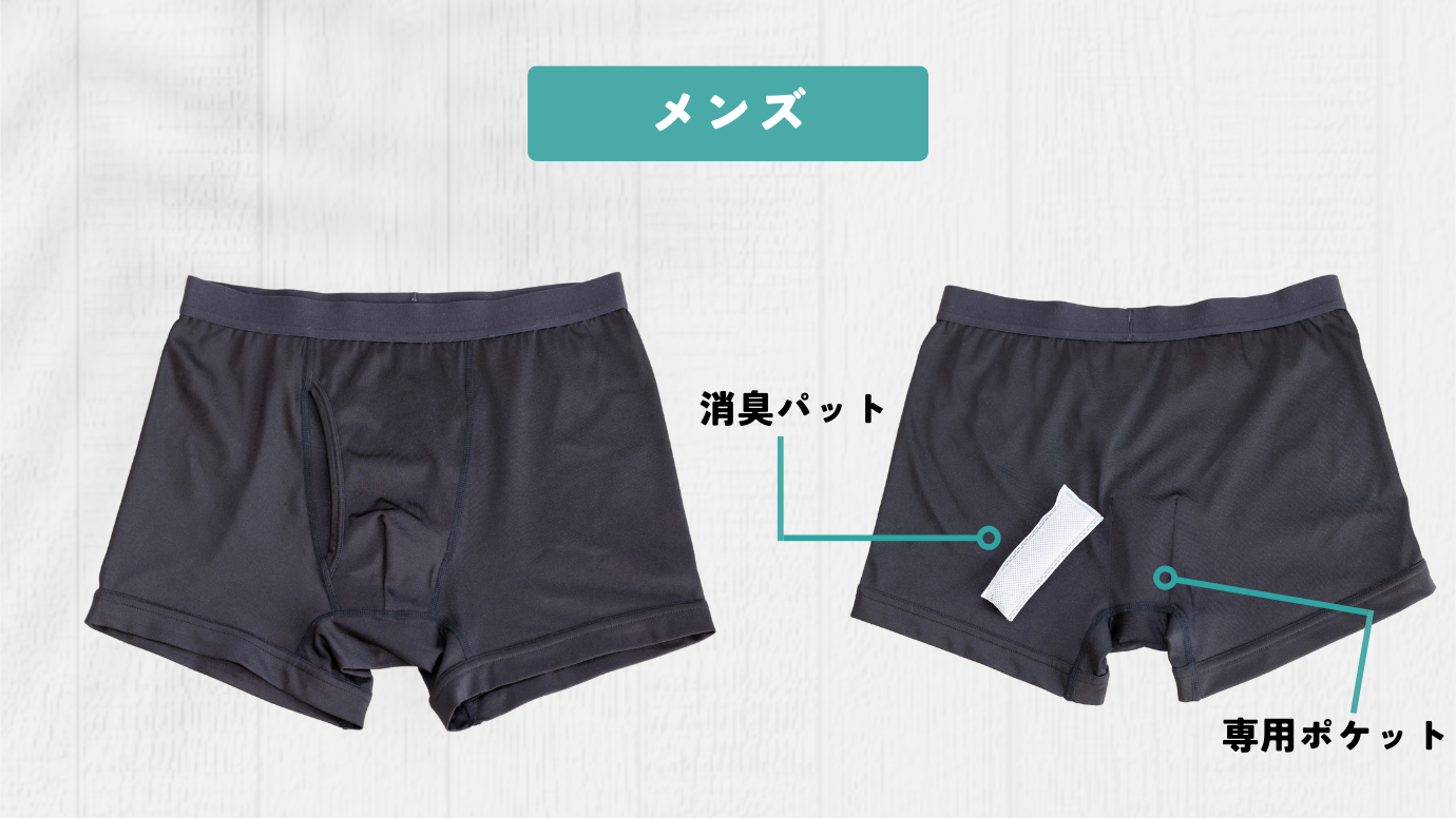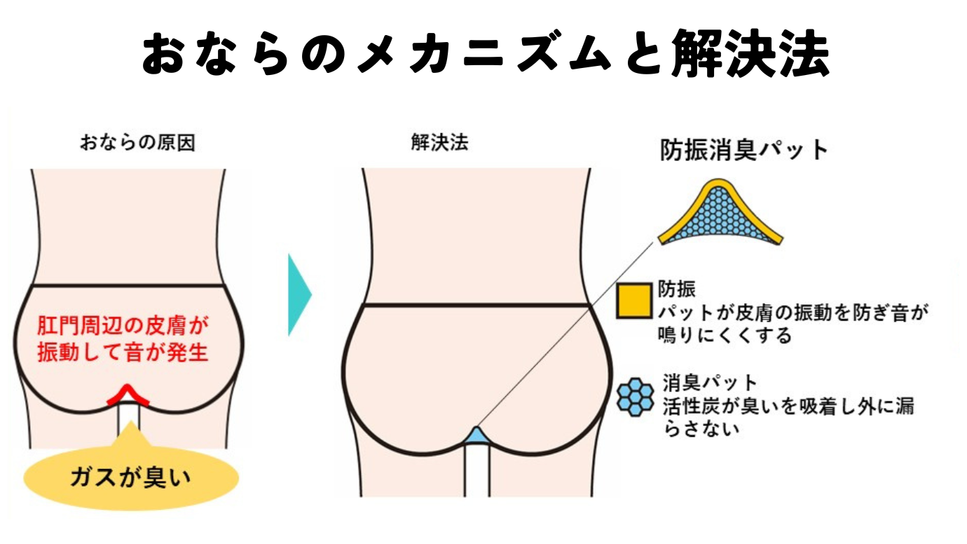 おならの原因となる、肛門周辺の皮膚の振動を抑え、発生するガスのニオイを吸収する活性炭が入った専用パットをパンツ内部のポケットに挿入することで機能を発揮します。
