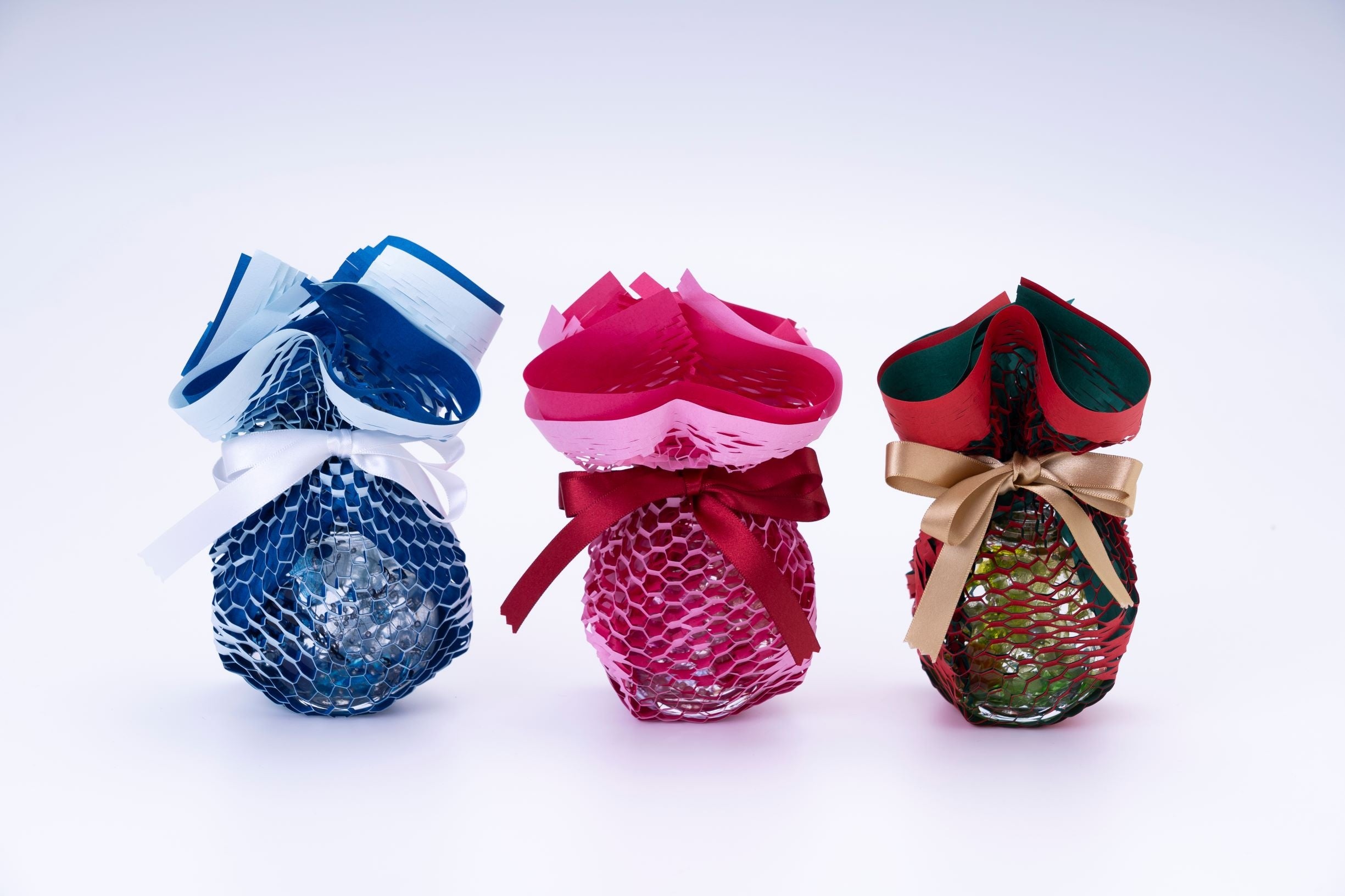 ファンシーペーパーに細かく交互に入れたスリット(切れ込み)を開き立体的にすることで商品を保護し、優れた意匠性を持つクッション材としてお使いいただけます。