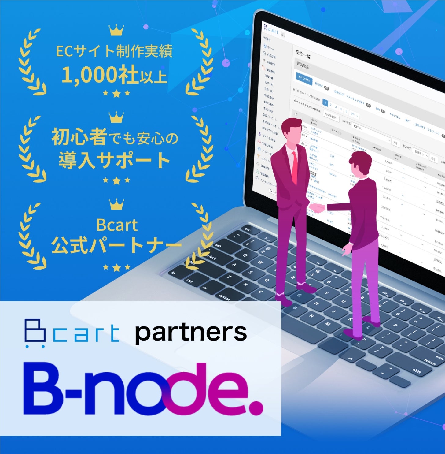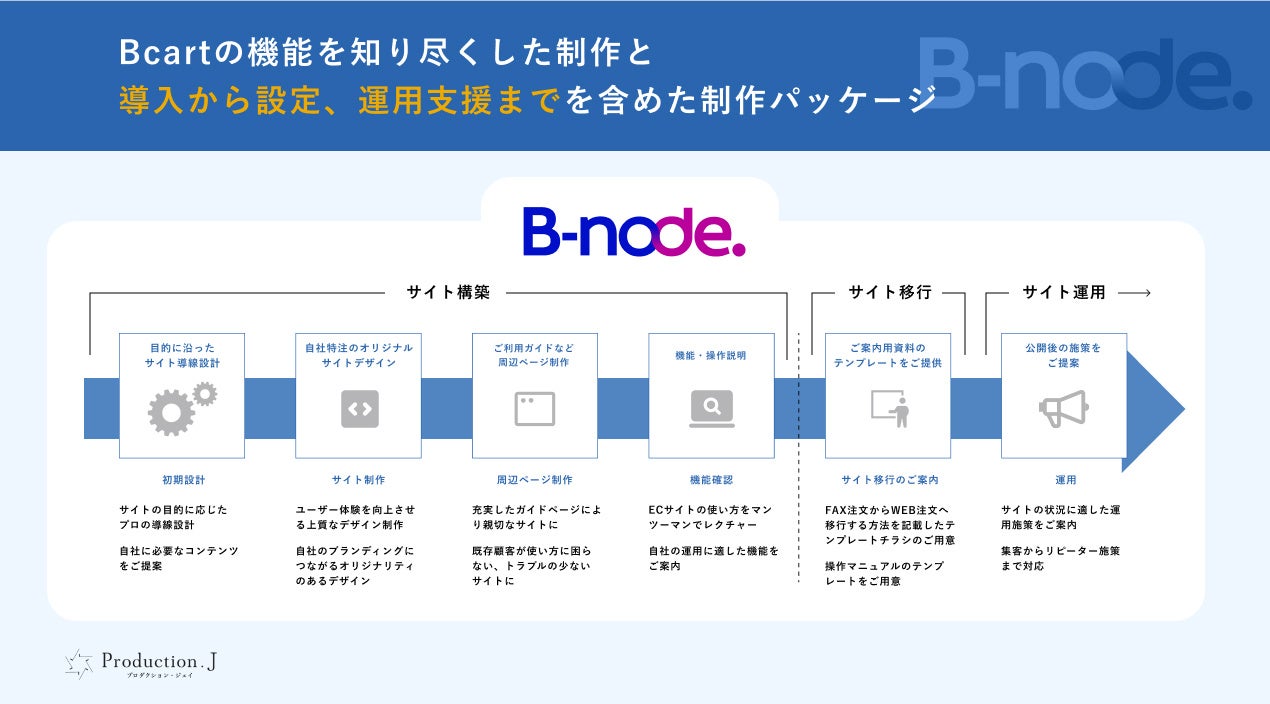 さらにB-node.では、Bcartの導入から構築、運用補助ツールなどの全般的なサポートを提供します。必要な機能のカスタマイズ、運用方法のレクチャー、運用時を想定したフォローまで、私たちが一貫して行います。