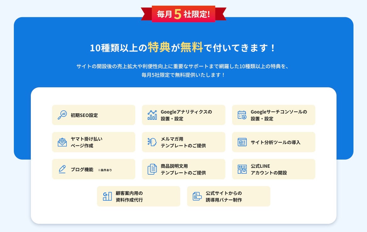 サイトの開設後の売上拡大や利便性向上に重要なサポートまで網羅した10種類以上の特典を、