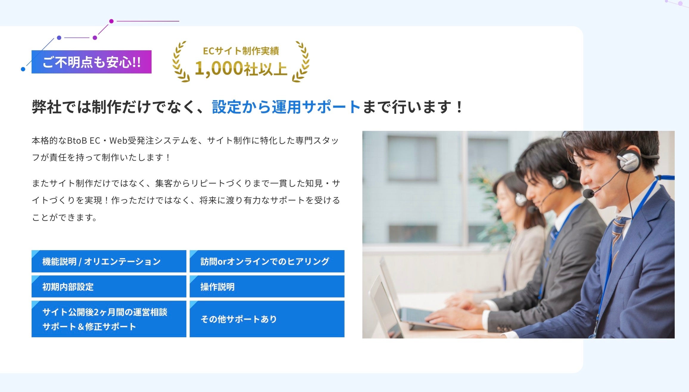 ノウハウや経験がなくても安心。Bcartの内部設定からプロの動線設計・オリジナルデザイン制作まで、全て私たちが担当します。また、お客様への案内資料やマニュアルテンプレートのご用意、さらにはサイト公開後に必要な集客からリピーター施策のご相談も行えます。