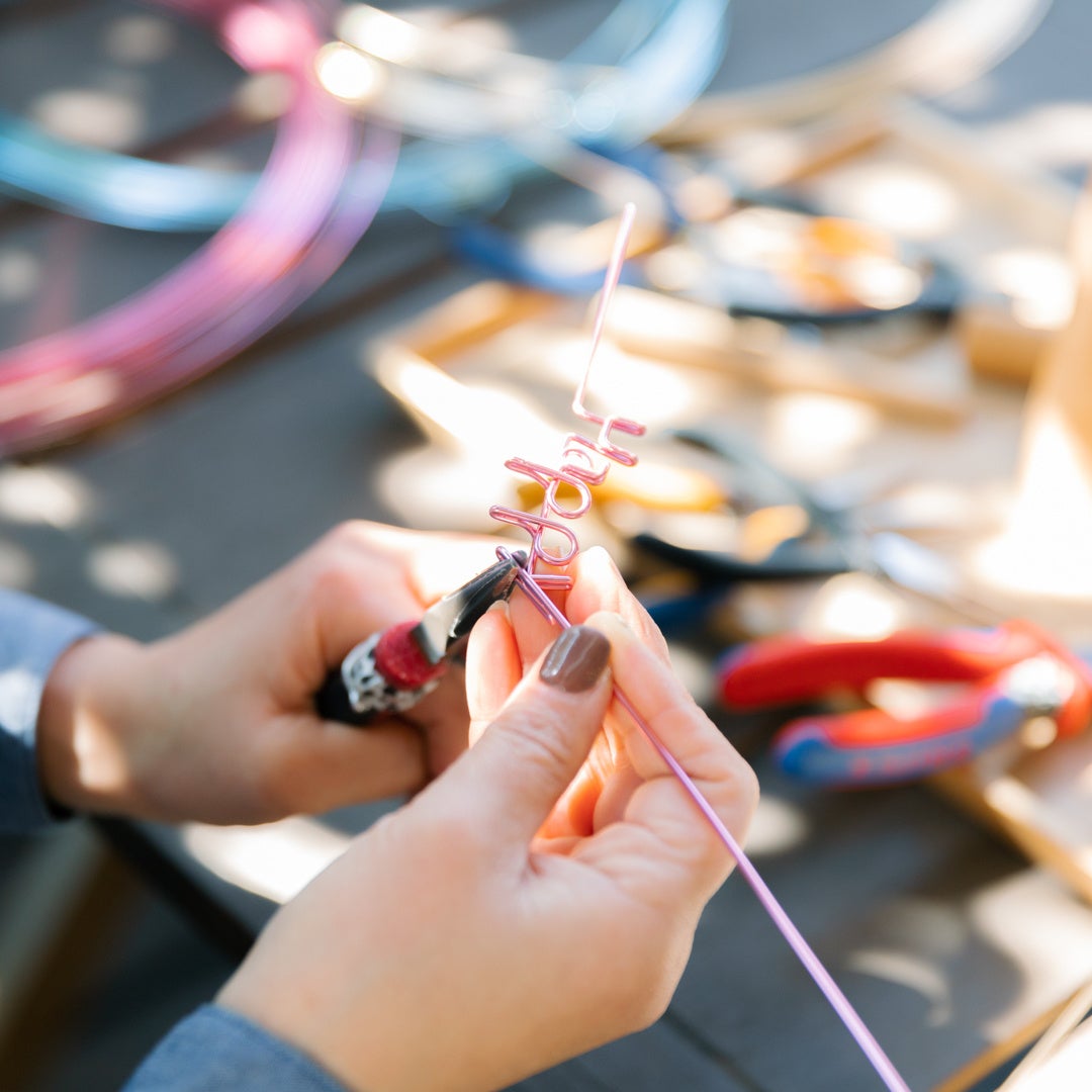 店舗内では、ワイヤーアートの職人が実際に製作しているところも見学ができ(職人が在店時に限る)、好みの色とワードで大切な人へのプレゼントや世界で一つだけのワイヤーアートとしてご活用いただけます。